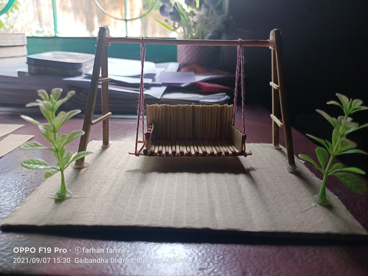 কাজ শেষ।এবার সৌন্দর্য বৃদ্ধির জন্য কার্ডবোর্ডের উপর দোলনাটি রেখে চারপাশে গাছ লাগিয়ে দিতে পারেন।এক্ষেত্রে ফেভিকলের চেয়ে গ্লুগান বেশি কার্যকারী হবে।
