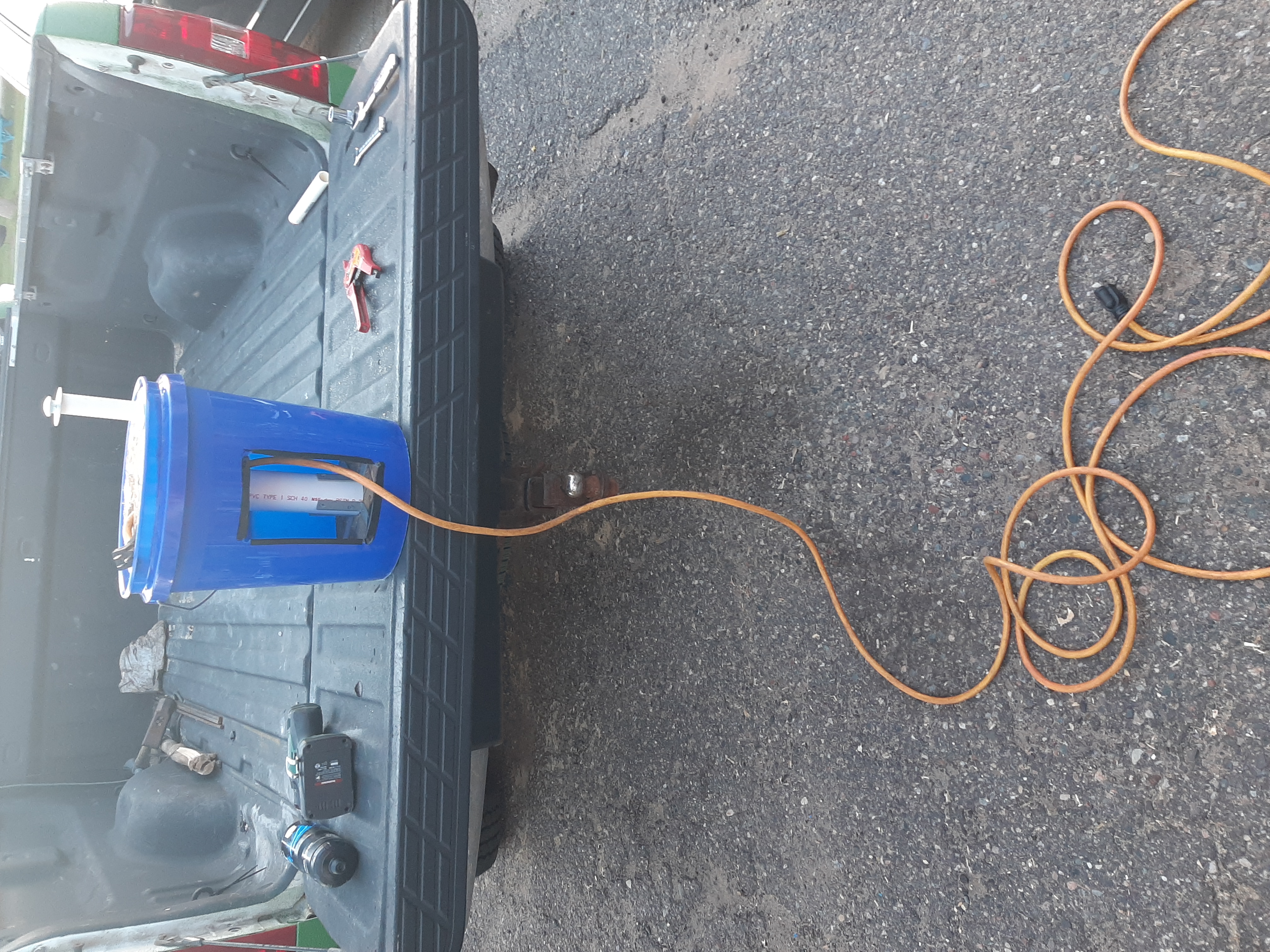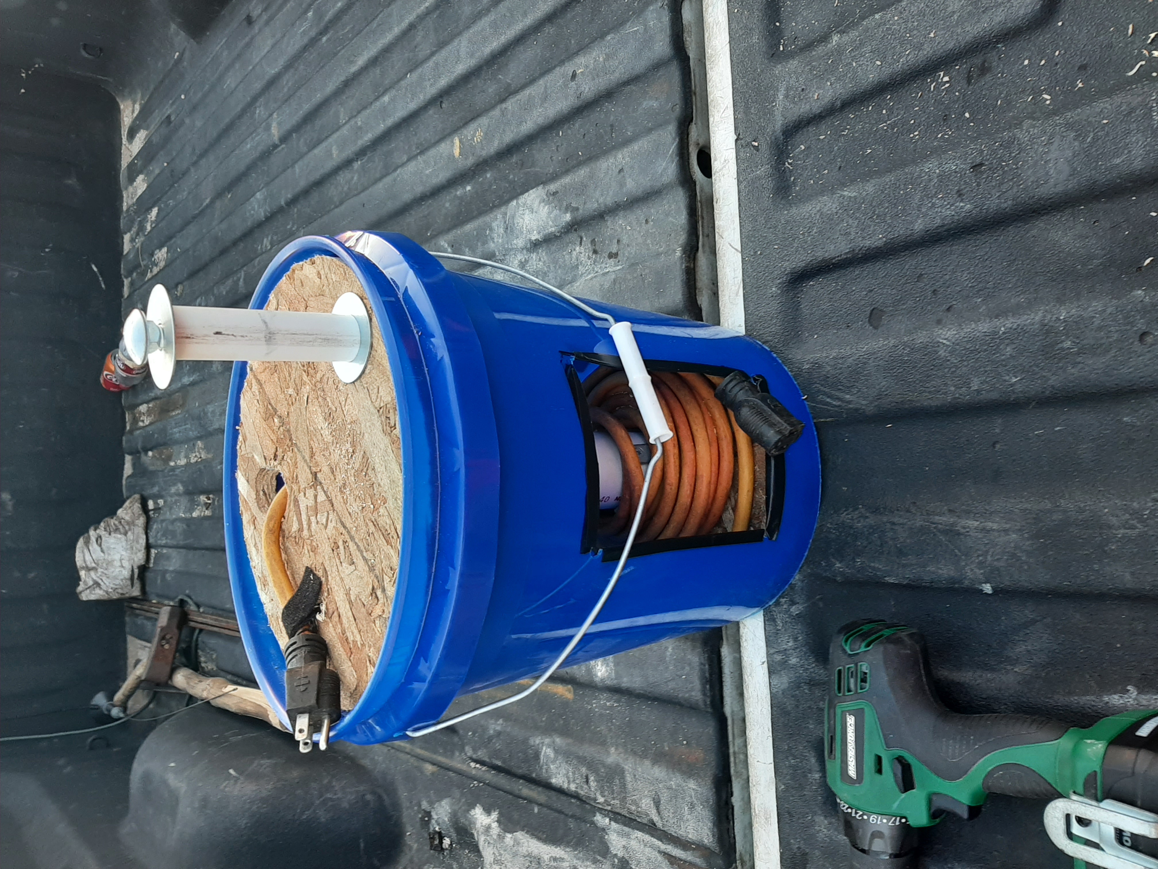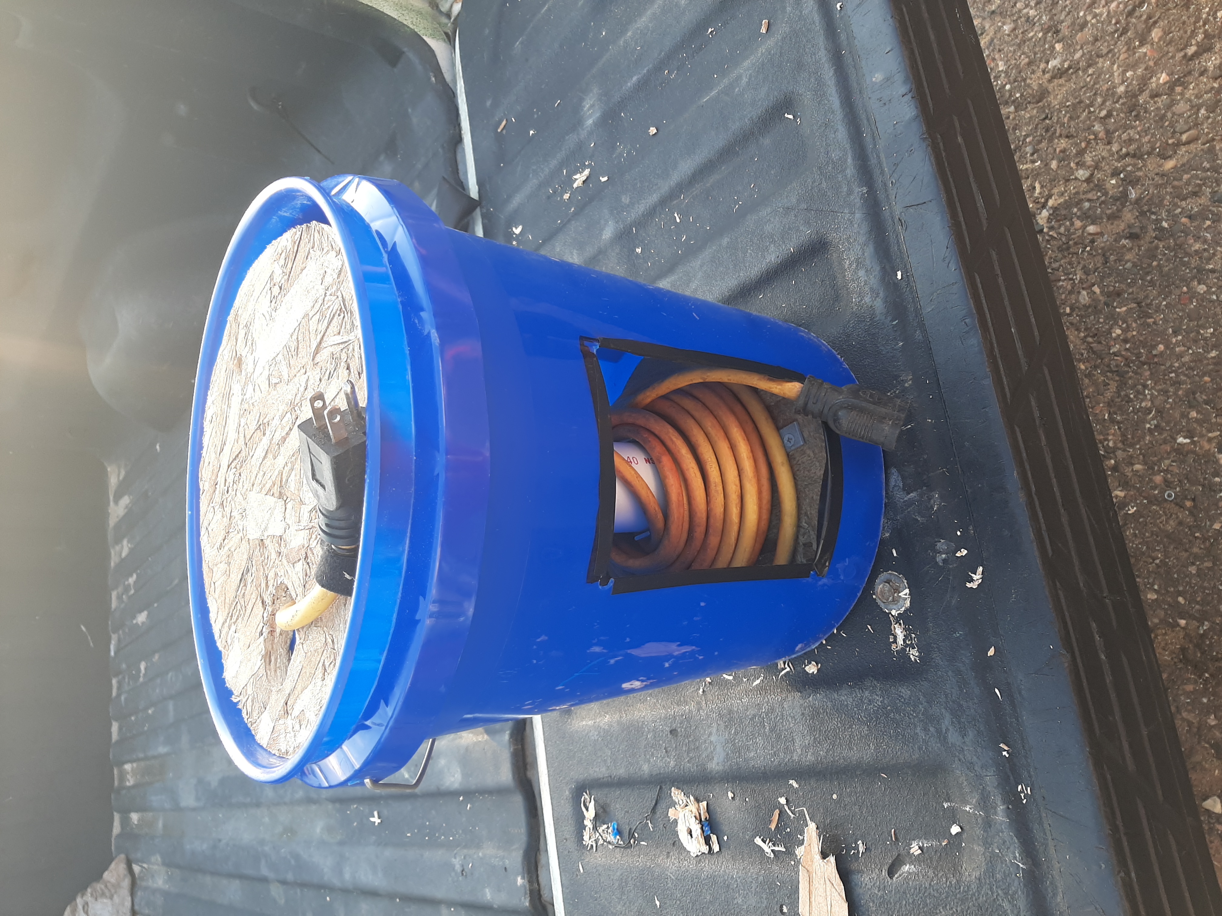 8th The end that plugs into the wall should go through a hole in plywood on top and have enough cord to reach outlet from bucket being set next to outlet. keep it velcroed when not in use. Pull cord out of bucket prior to plugging it in...