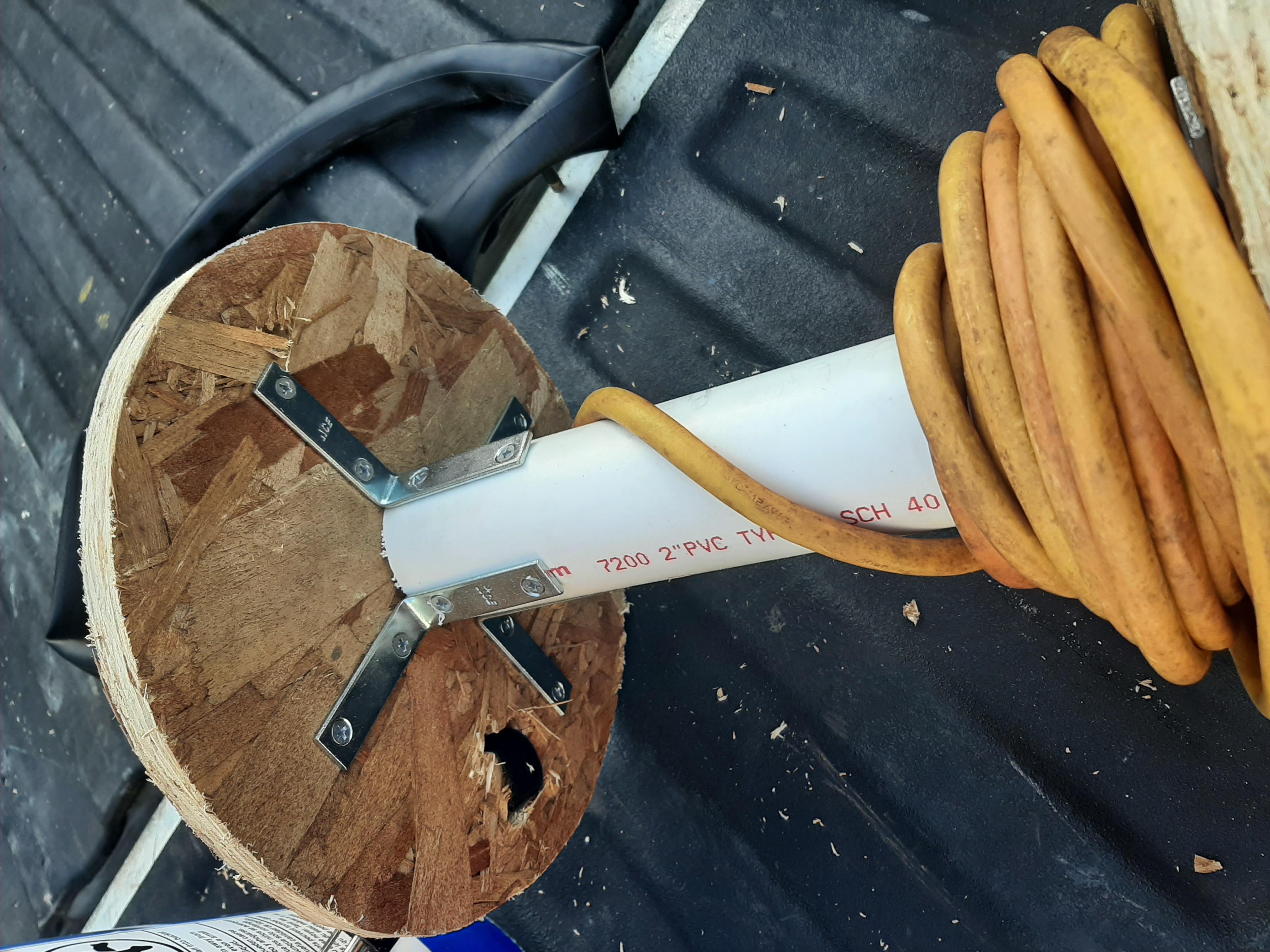 4th Attach brackets to PVC pipe and plywood as seen in pictures and drill a hole near the edge of top board and run cord end through the hole then wrap power cord around PVC pipe...