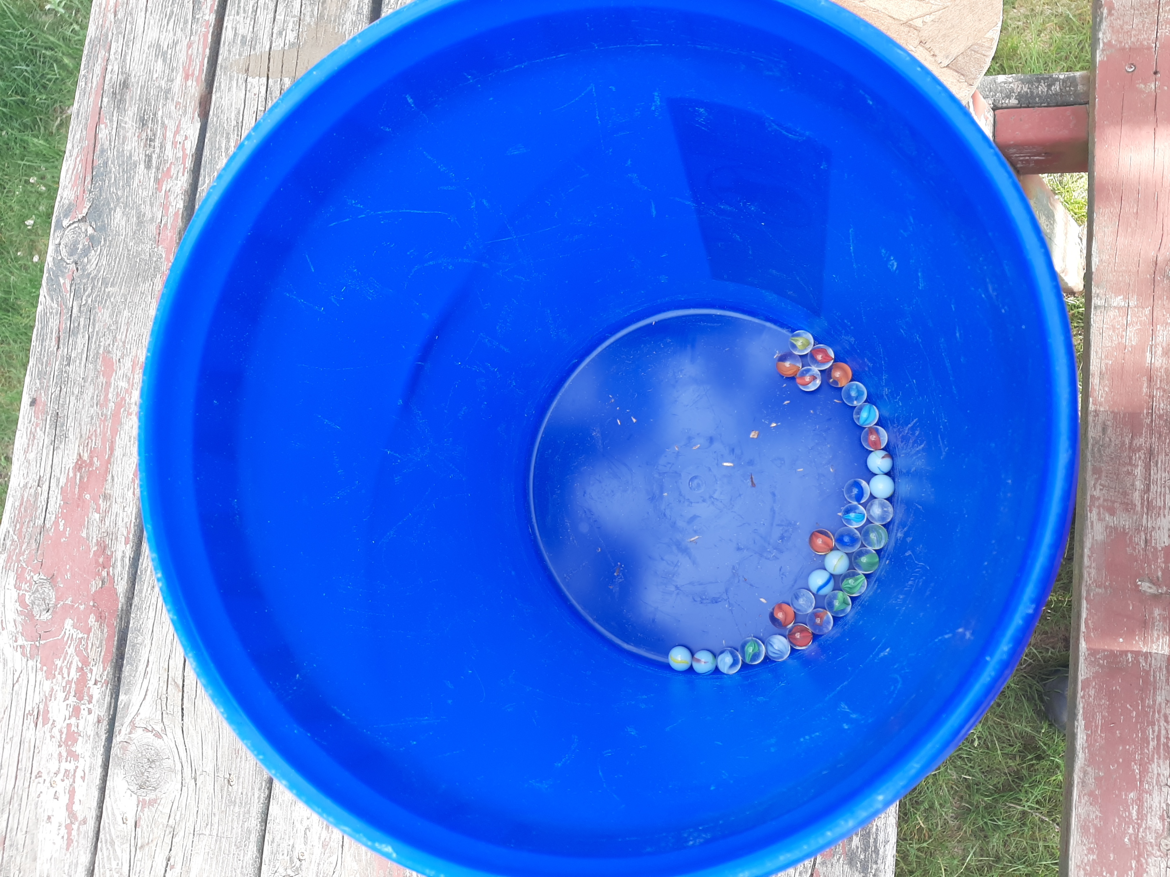 1st grab a bucket and toss a few marbles in it: