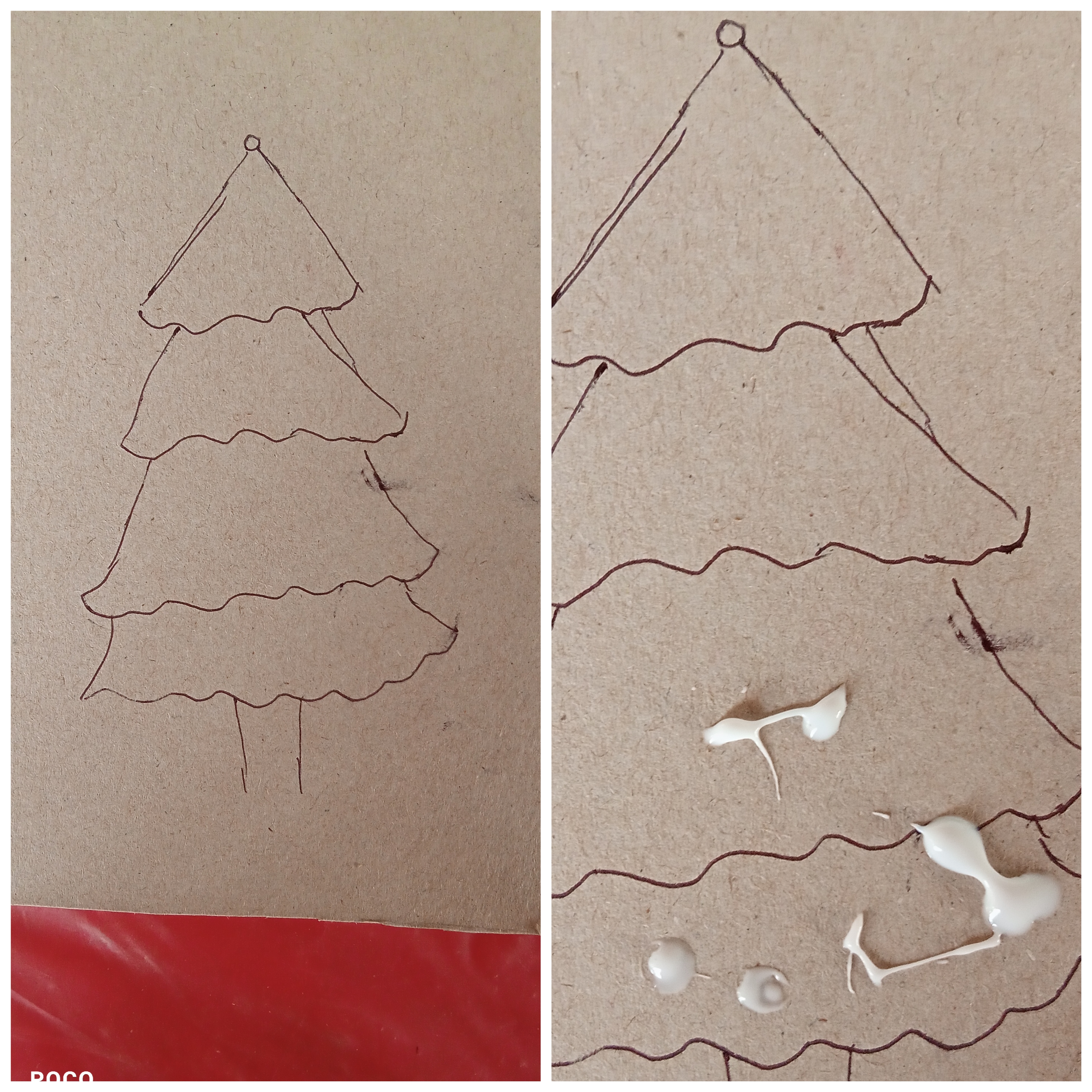 ◆একটি পেন দিয়ে কেটে নেওয়া কাগজের উপর ট্রির চিত্ৰ একে নেব।তার উপরে আঠা লাগিয়ে নেব।