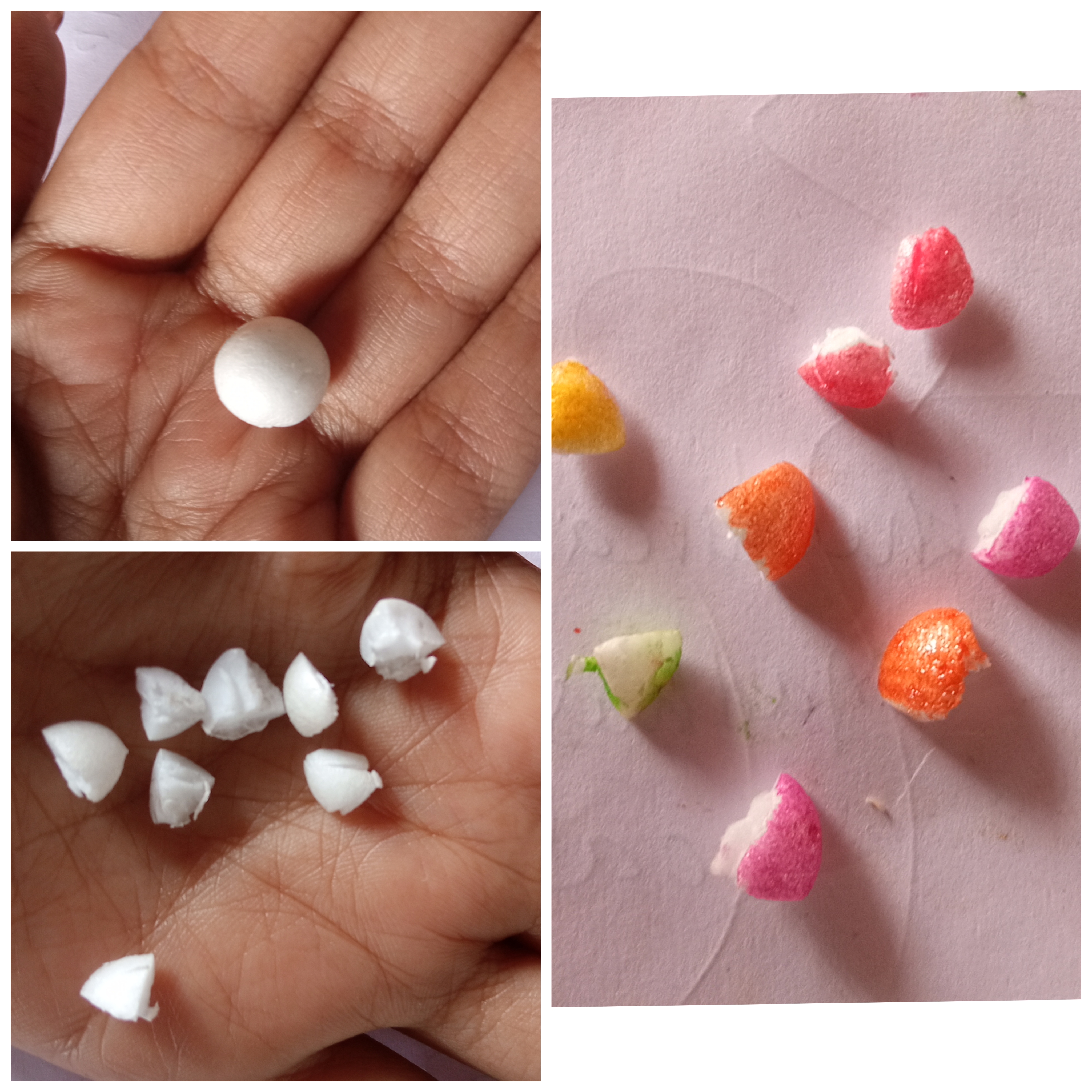 ◆এরপর একটি ছোট সাদা রঙের থার্মোকলের বল নিয়ে নিলাম ।সেটি কেচি দিয়ে কেটে টুকরো টুকরো করে নিলাম।বিভিন্ন রঙের জেল পেন দিয়ে একে নিলাম থার্মোকলের গায়ে।