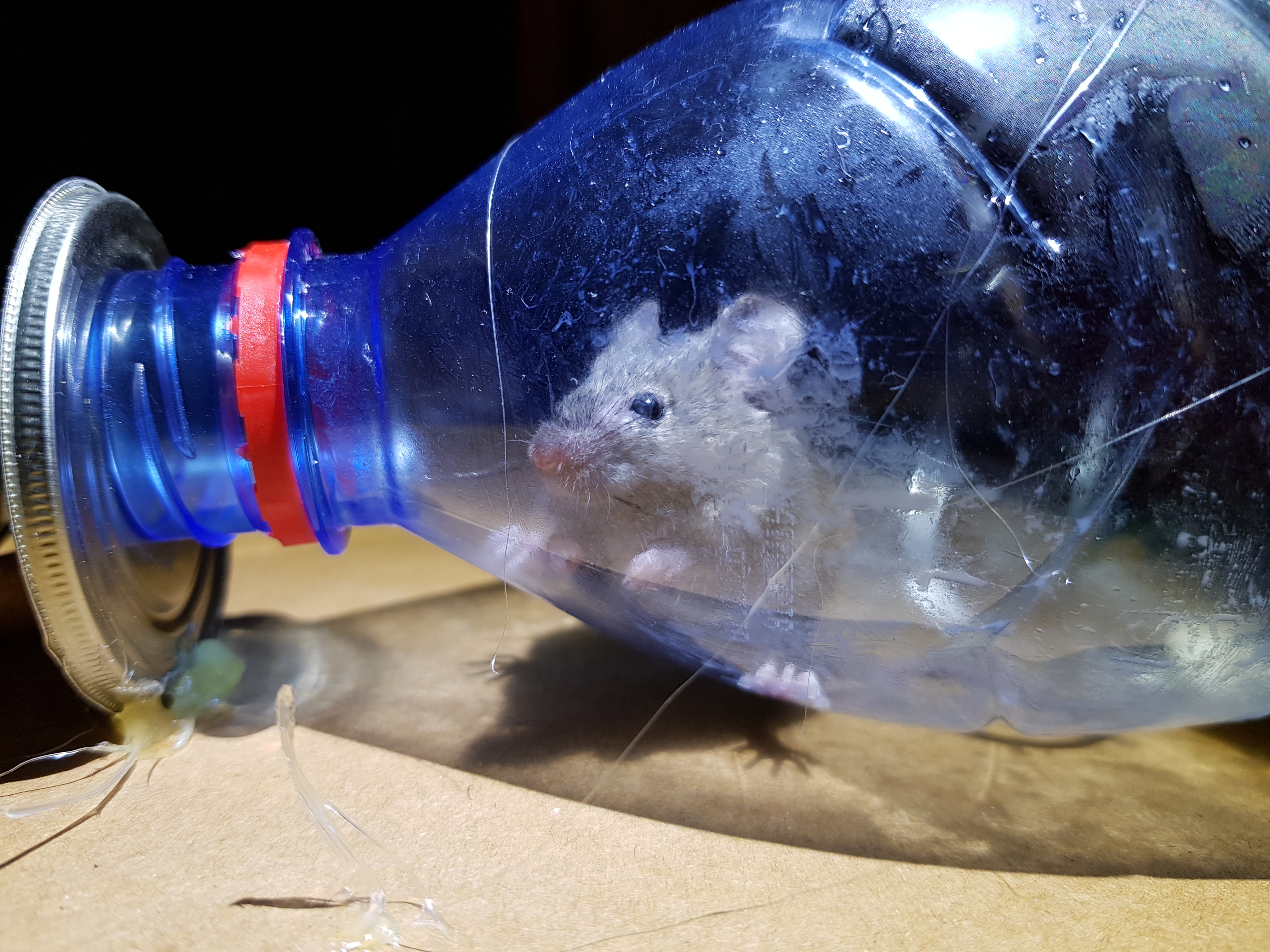 Just half an hour later... BINGO!!! first mouse trapped in the bottle, took a walk to the forrest and released the little guy. I placed the bottle back again to see if there where more... and an hour later the second mouse got trapped.