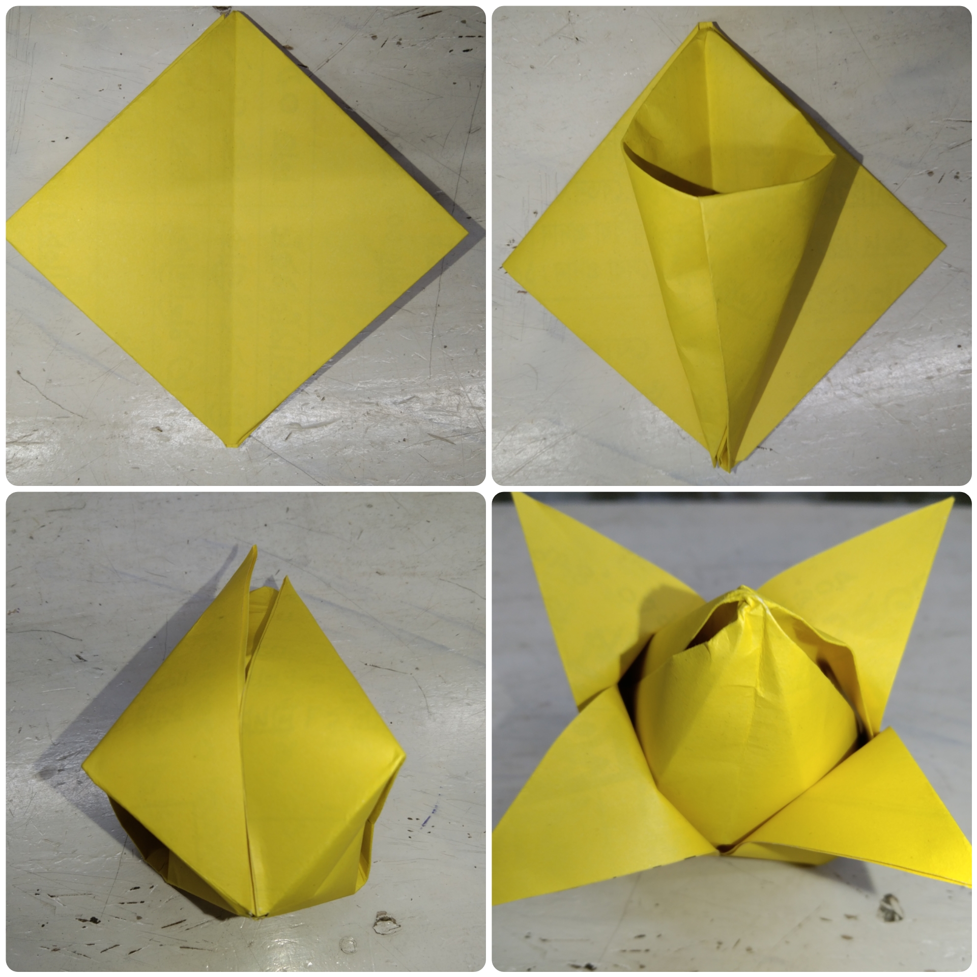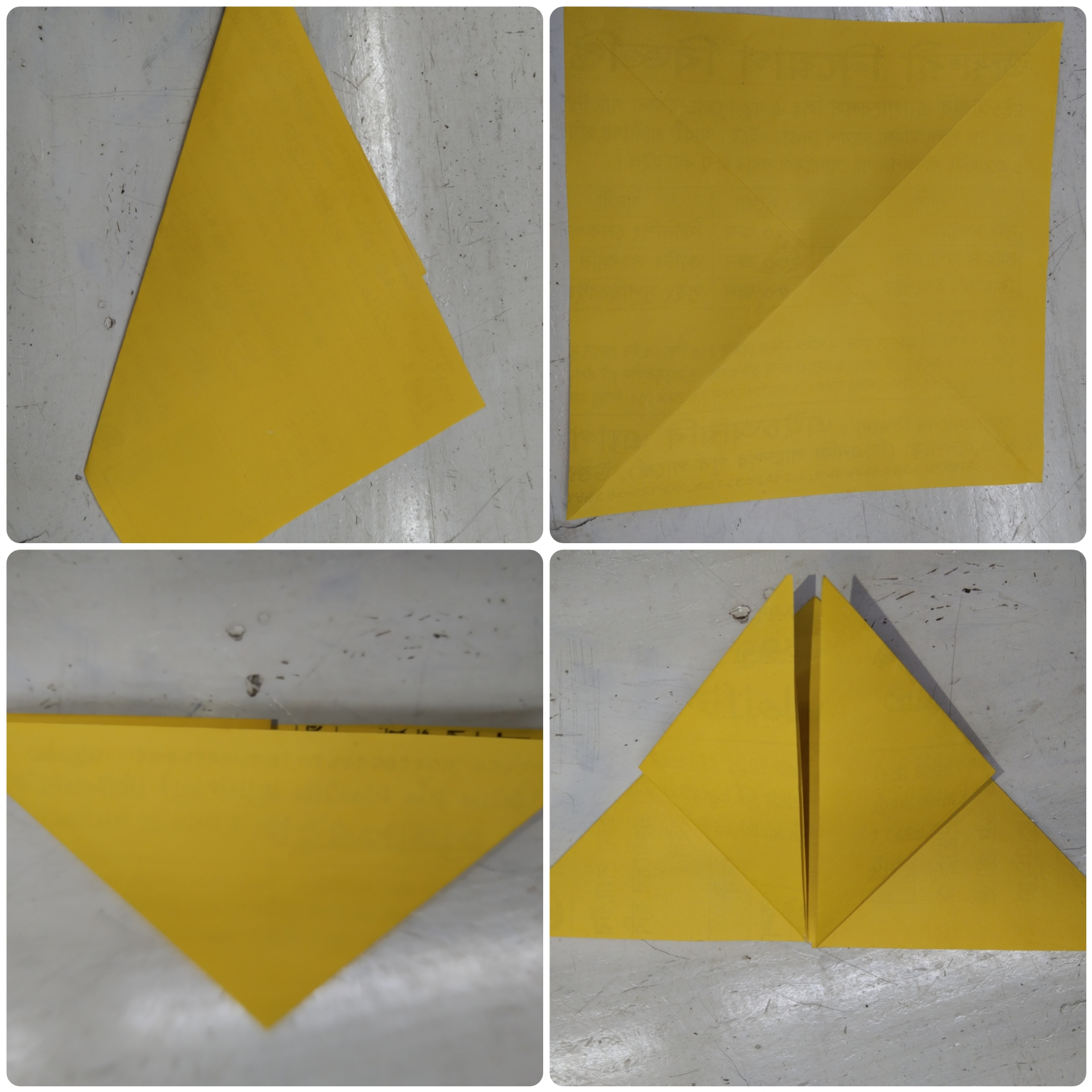 | আমি প্রথমেই রঙিন কাগজ নিলাম। এবার আমি কাজটিকে এক পাশে দিয়ে ভাজ করে নিলাম। এবার আমি অপর পাশে ভাজ করে নিলাম। এবার আমি ভাঁজ গুলো ভিতরে ঢুকিয়ে দিলাম। এবার ছোট ভাঁজ করে নিলাম দুইদিক দিয়ে। |