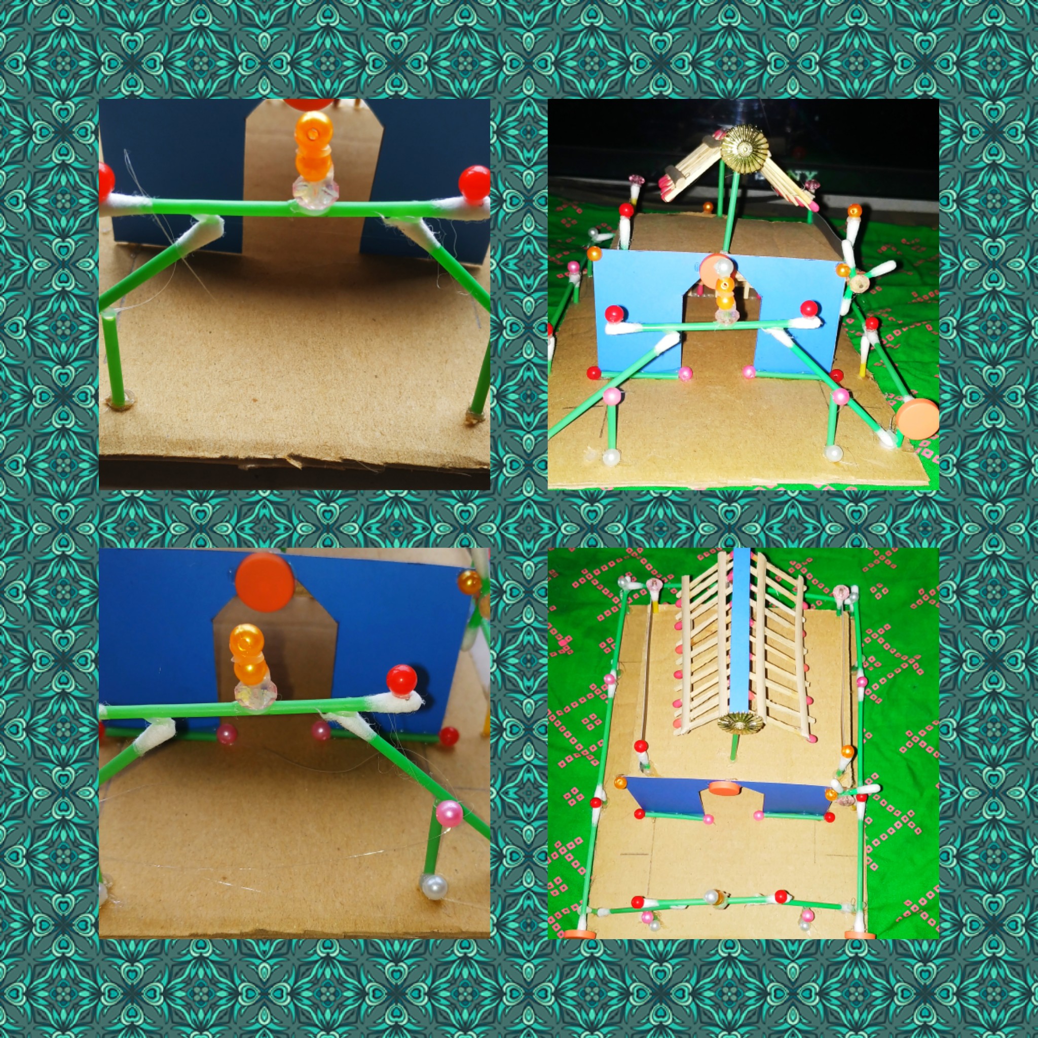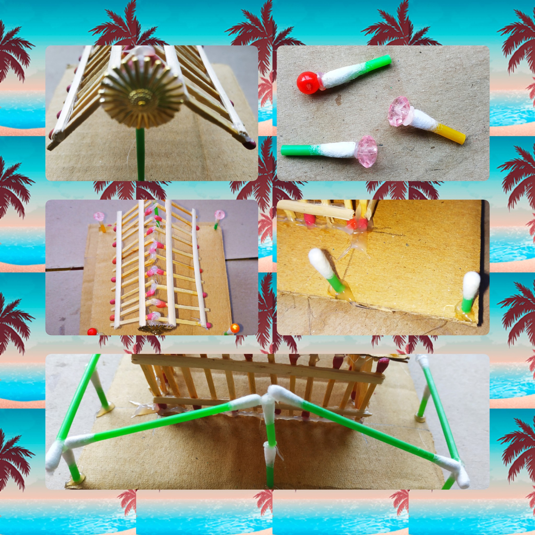 এই ধাপে এসে আমি আপনাদেরকে দেখানোর চেষ্টা করেছি ম্যাচের কাঠি দিয়ে বানানো চিলেকোঠা। প্রথমে দুইটা দেয়াল দিয়ে চিলেকোঠার পার্টিশন তৈরি করে, তারপরে কটনবার দিয়ে চিলেকোঠার খুঁটি তৈরি করি। তৈরি করার পরে ঘরের উপরে গ্লু গান আঠা সাহায্যে সুন্দর করে বসিয়ে দিই। চিত্র লক্ষ্য করলে দেখতে পাবেন। |