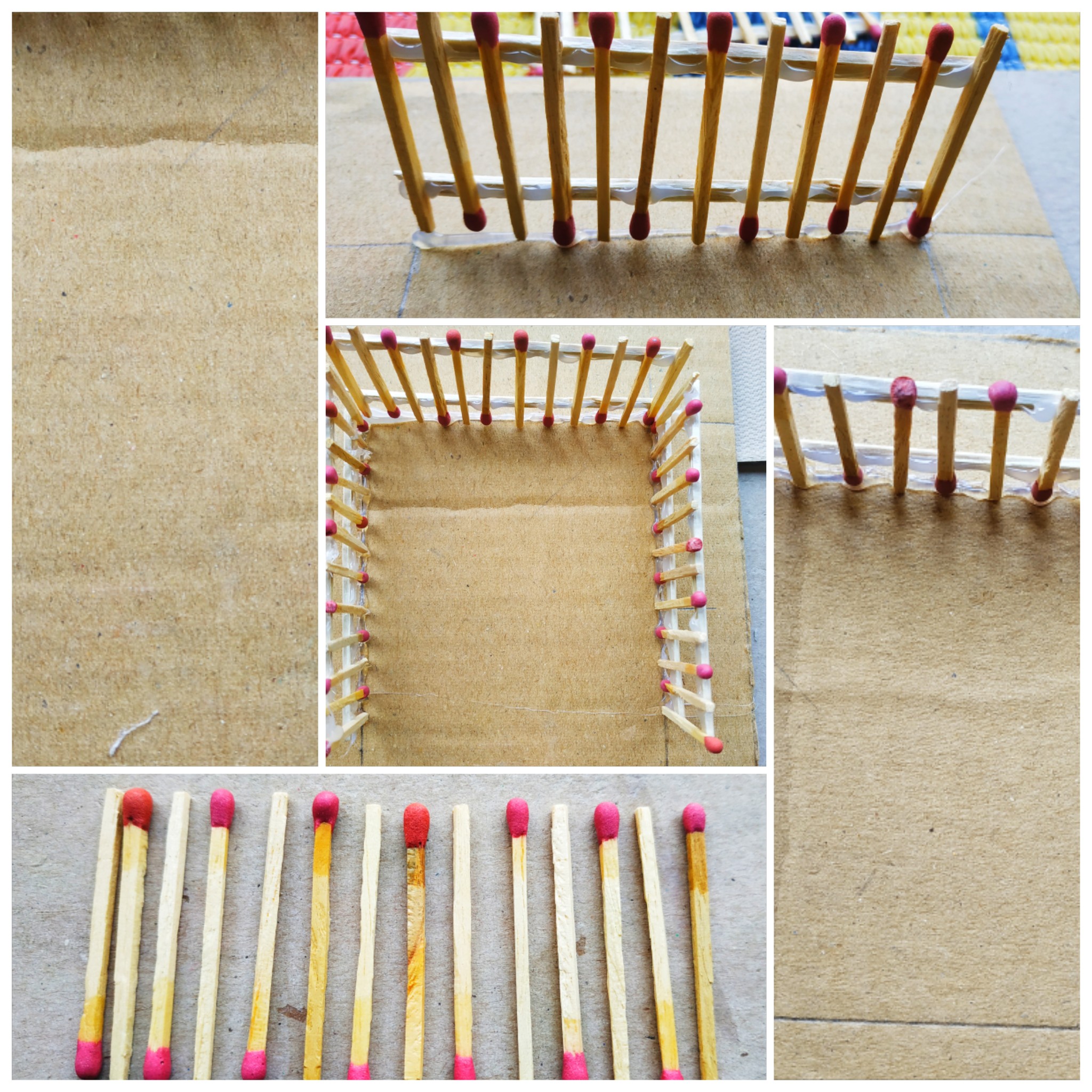 শুরুতেই আমি প্রথমে কিছু দিয়াশলাই একটা একটা করে ফাঁকা ফাঁকা করে সাজিয়ে নিই। তার উপরে পাটকাঠির সাথে গ্লু গান আঠা লাগিয়ে বসিয়ে চরাট তৈরি করি। এভাবে সব গুলো সম্পন্ন হলে নির্দিষ্ট মাপের একটি নিদিষ্ট মাপের কার্টুনের উপর দেয়াল গুলো দৈর্ঘতে দুটি এবং প্রস্থ তে একটি সুন্দর মত গ্লু গান আঠা দিয়ে কাটুন এর উপর বসিয়ে দিই। |