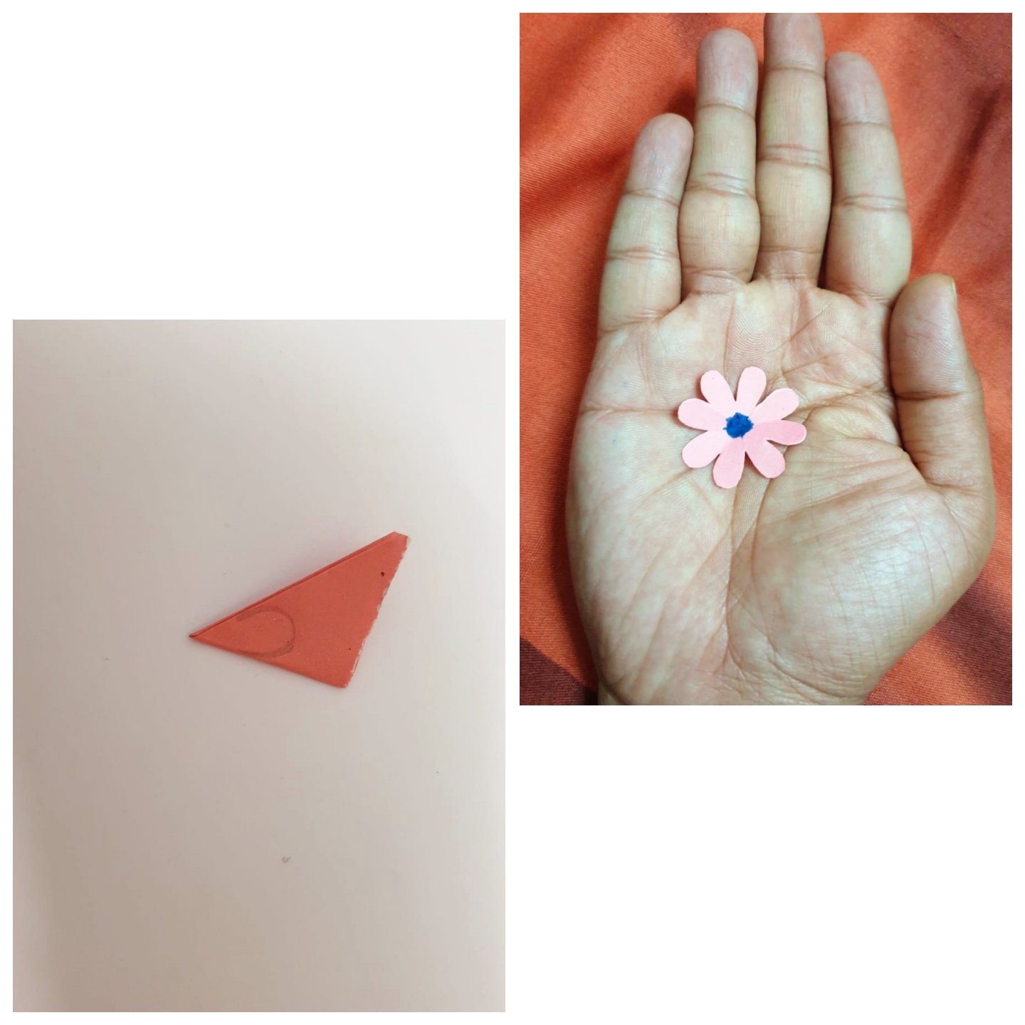 তারপর কাগজ তিন ভাজ করে, পেন্সিল দিয়ে চিত্রের মতো করে এঁকে নিলাম। এরপর দাগ অনুযায়ী কাঁচি দিয়ে কেটে ফুল তৈরি করে নিলাম। একইভাবে আরও একটি ফুল তৈরি করে নিবো।