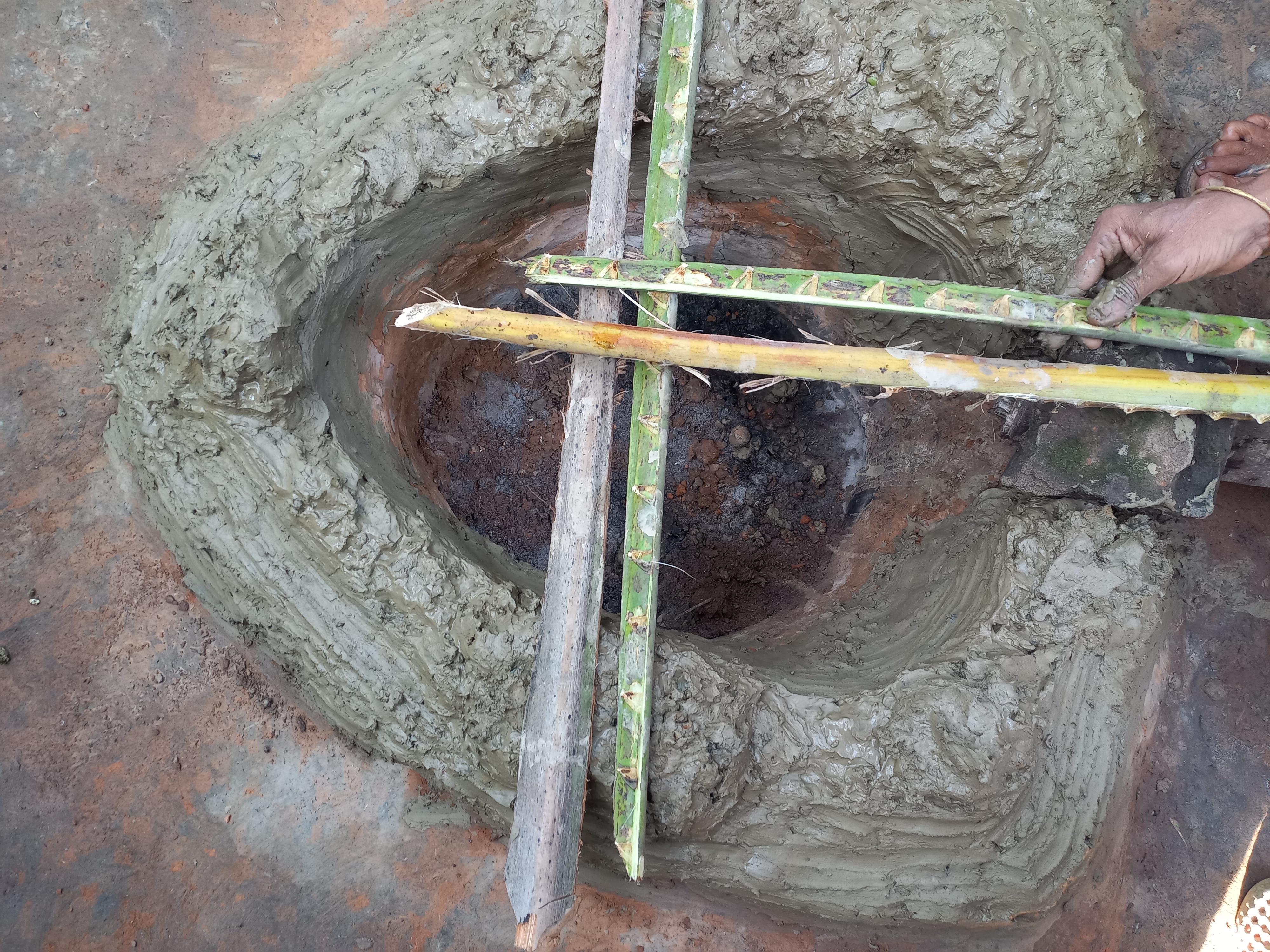 এবার চুলার সামনে একটি ইট বসিয়ে তার উপর দুই দিকে চারটি লাঠি দিয়ে দিতে হবে।