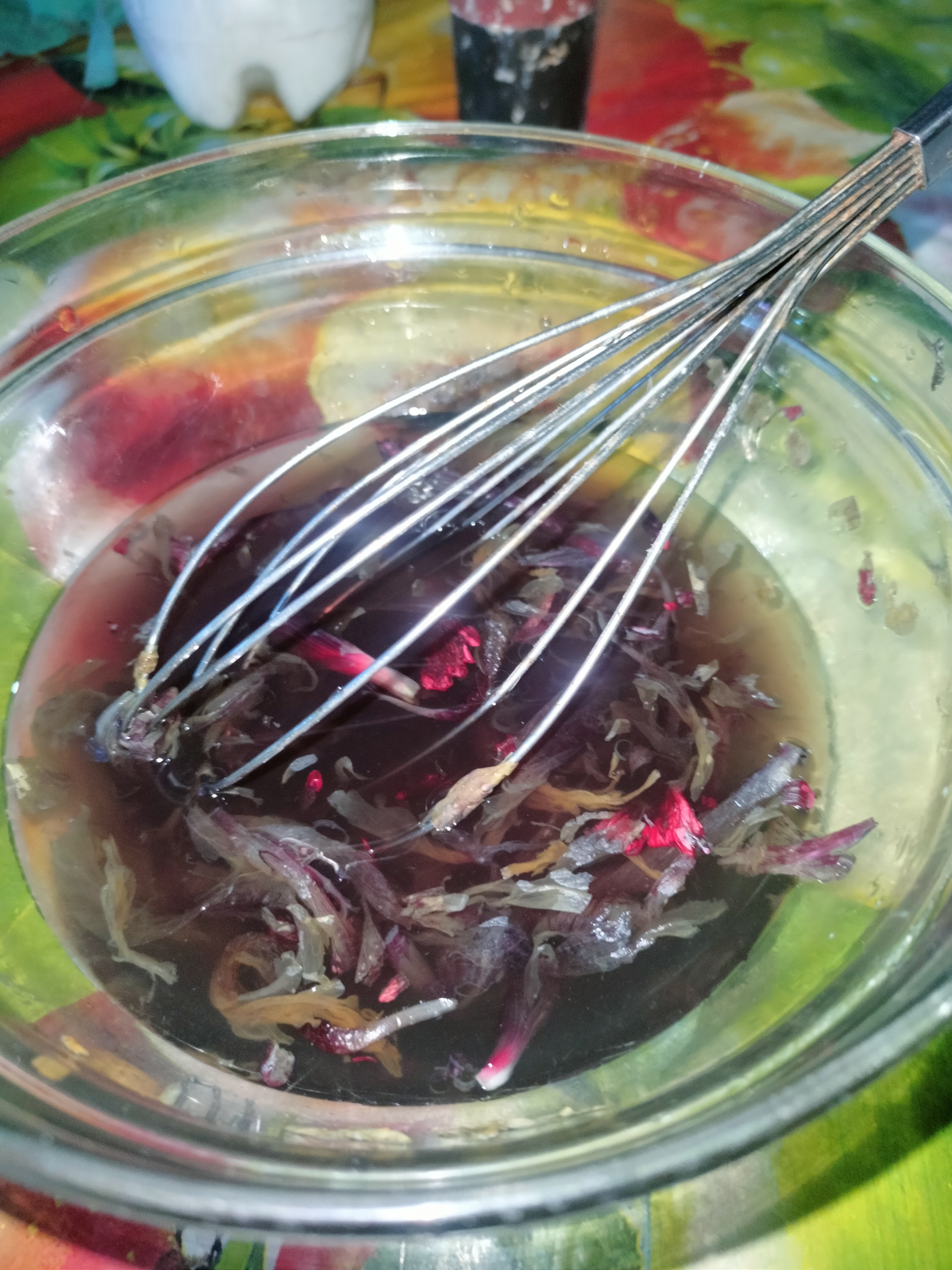এরপর প্রথমে পানিগুলো নেড়েচেড়ে নিলাম। একটি ছাঁকনি দিয়ে জবা ফুল থেকে পানিগুলো নিলাম। না হয় ফুলগুলো মাথার চুলের সাথে মিশে যাবে।