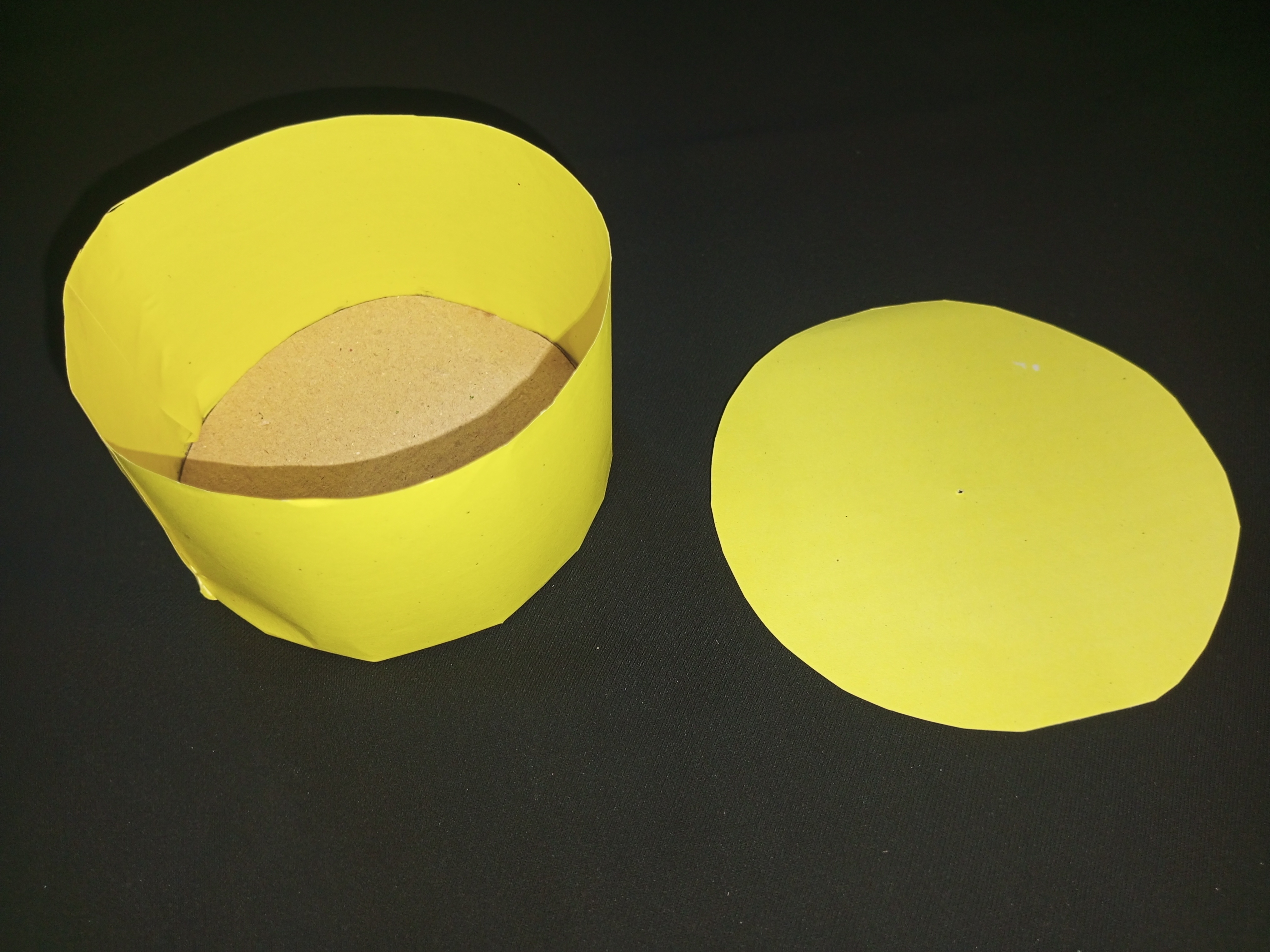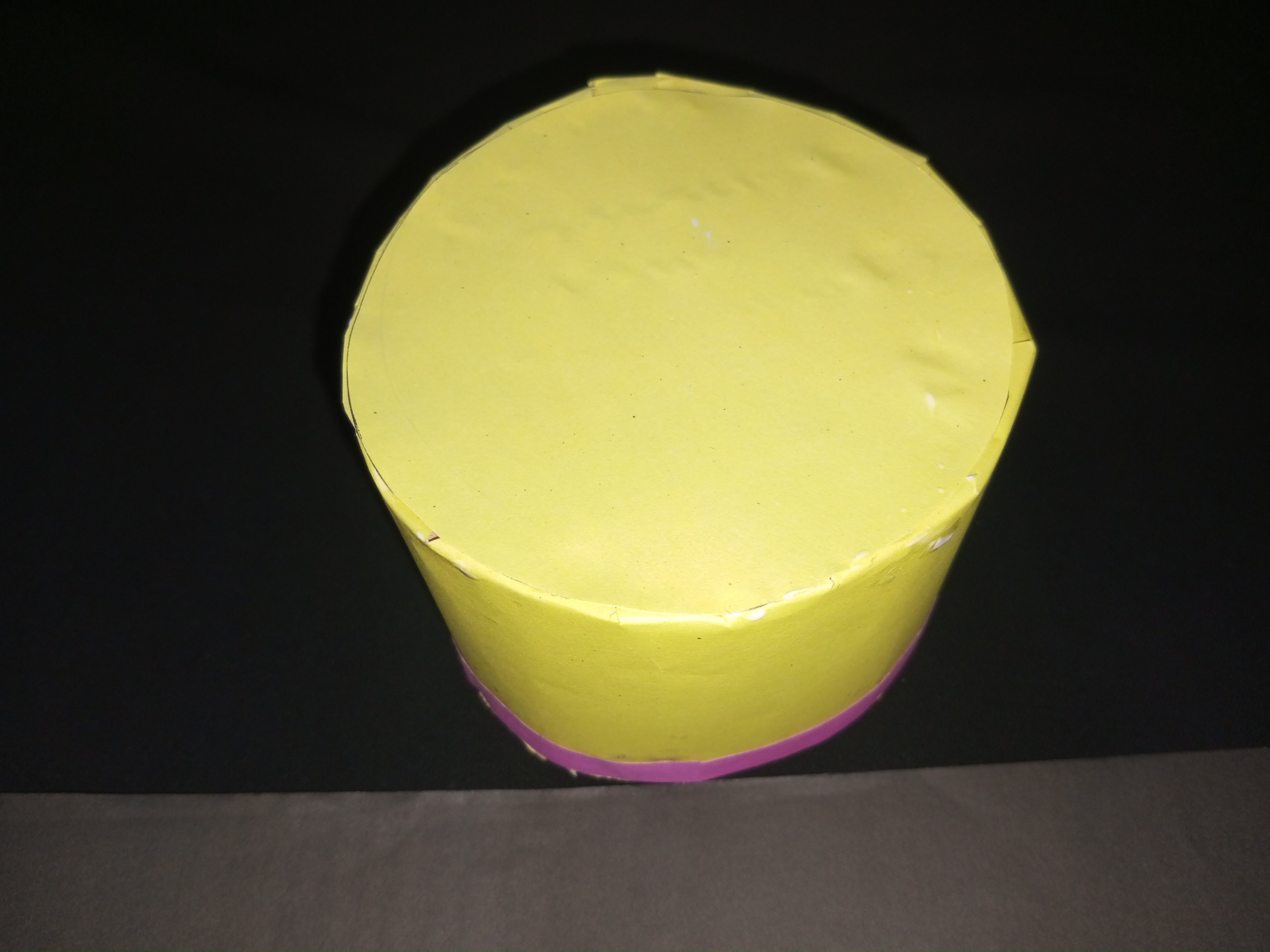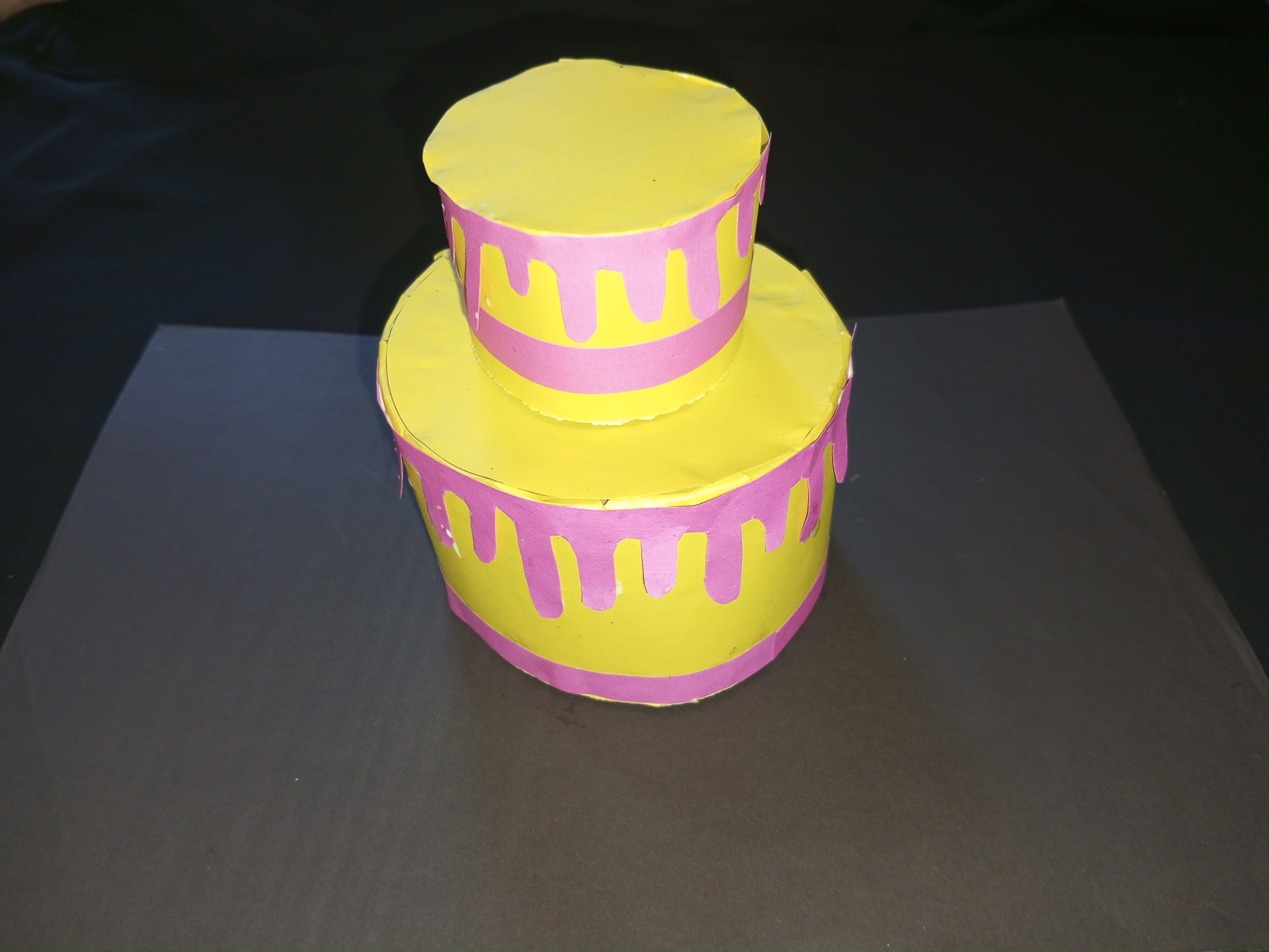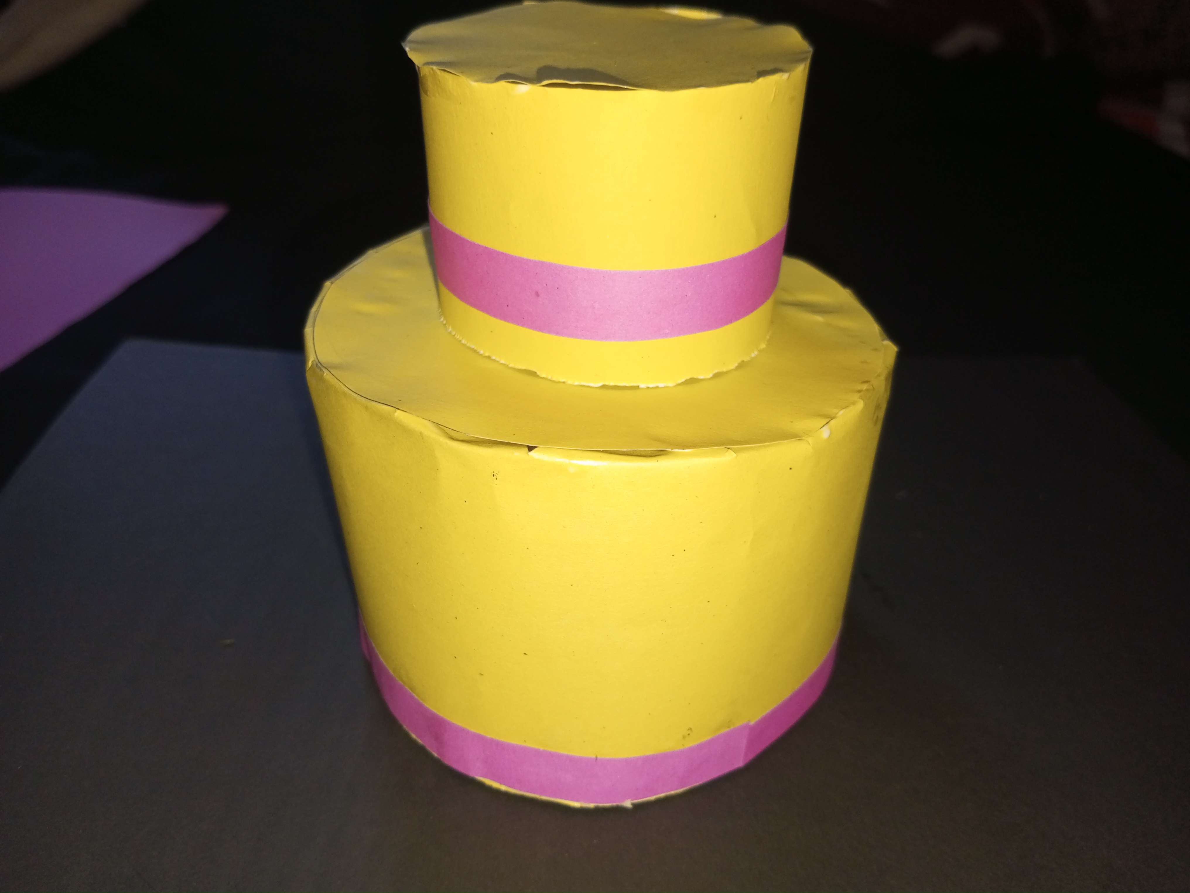 এখন অপরপ্রান্ত আটকানোর জন্য আরও একটি হলুদ কালারের কাগজ কম্পাসের সাহায্যে গোল করে কেটে নিয়েছি এবং আঠা দিয়ে অপরপ্রান্তে লাগিয়ে নিয়েছি। গোলাপি কালারের কাগজ চিকন করে কেটে কেকের প্রথম পার্টের নিচে লাগিয়ে নিব আঠা দিয়ে।