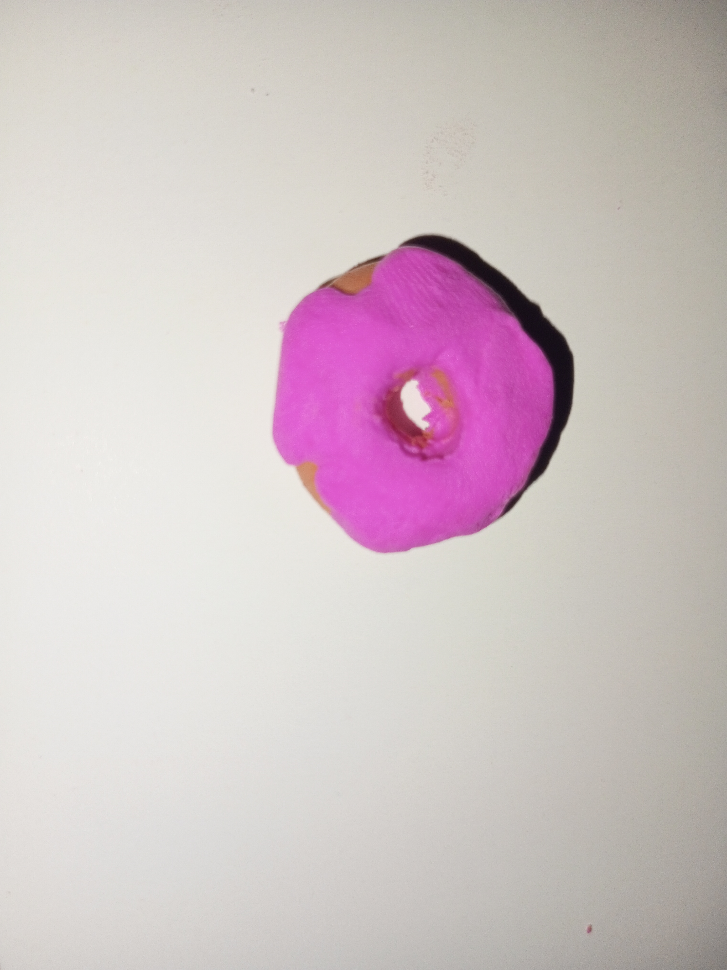 ডোনাটের উপর যেহেতু চকলেট থাকে তাই আমি গোলাপী ক্লে এর সাহায্যে চকলেটের মত করে ডোনাটটির উপর বসিয়ে দিয়েছি।