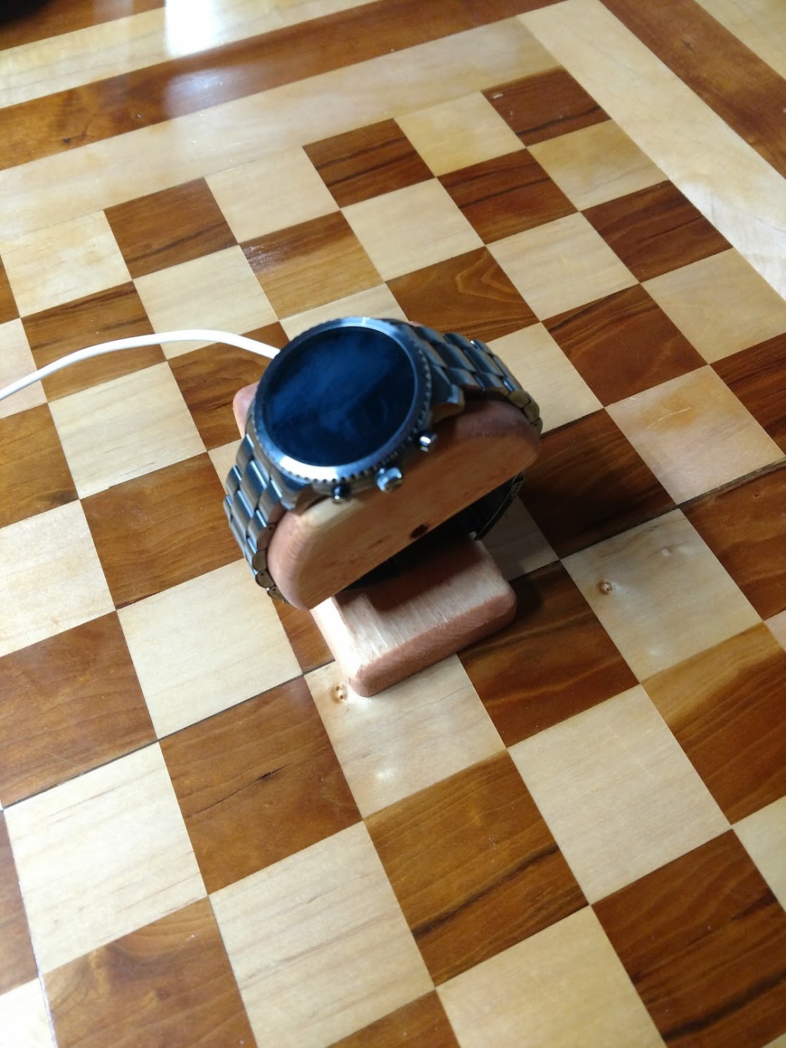 The varnish didn't turn out as we hoped, but the watch slips right on and slips into place with the charging puck.