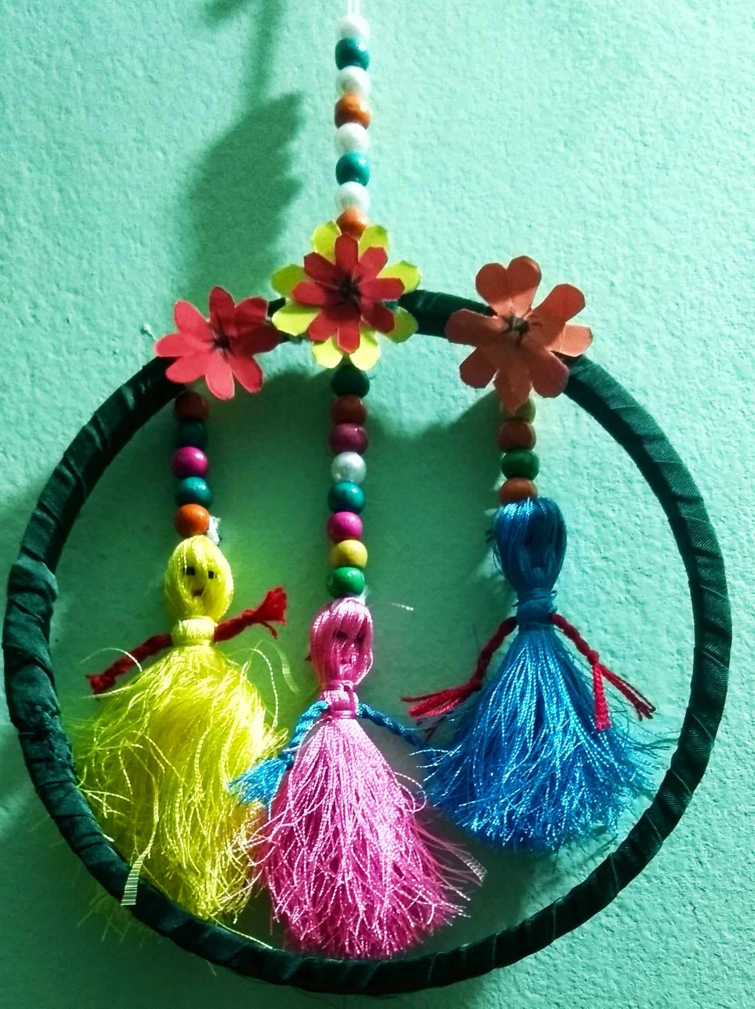 এবার বিভিন্ন রং এর কিছু ফুল কেটে নিয়েছি রঙ্গিন কাগজ দিয়ে। তৈরি করা কাগজের ফুল গুলো প্যাচিয়ে নেয়া সুতার উপর গাম দিয়ে লাগিয়ে দিয়েছি। যাতে সুতা গুলো দেখা না যা। আর দেখতে সুন্দর লাগে। আর একটি সুতায় পুথি ঢুকিয়ে নিয়েছি । এবং তা ফ্রেমের উপরে গিট দিয়ে লাগিয়ে নিয়েছি , যাতে দেয়ালে ঝুলিয়ে দেয়ার যায়।