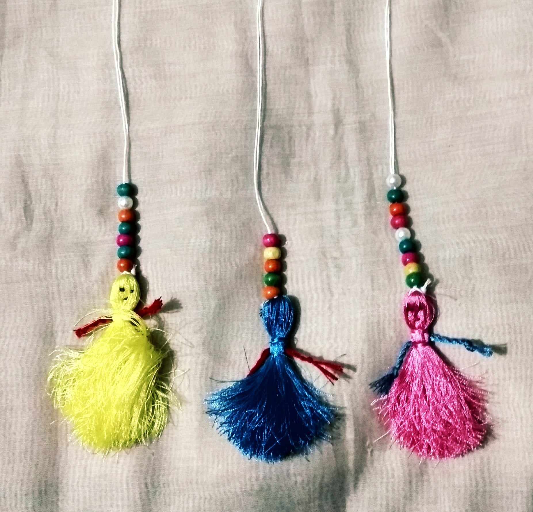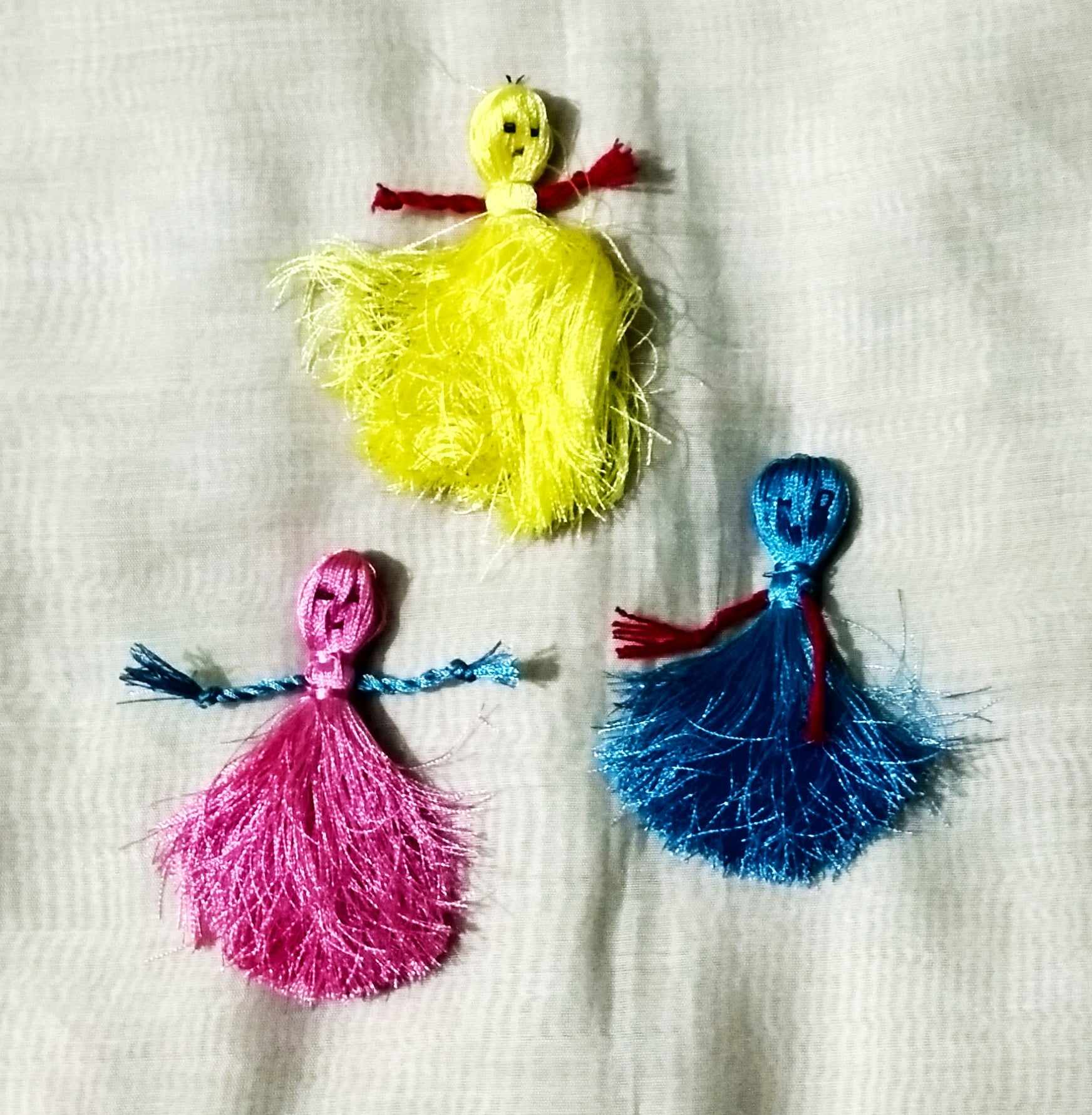 এবার একটি সুতা কয়েক ভাঁজ দিয়ে প্যাচিয়ে নিয়েছি। পুতুলের হাত বানানোর জন্য। প্যাচিয়ে নেয়া সুতাটি সুতার মাঝে ঢুকিয়ে দিয়ে নিচে সুতা দিয়ে বেঁধে দিয়েছি। এভাবে ভিন্ন ভিন্ন রং এর ৩টি পুতুল তৈরি করে নিয়েছি। এবং কালো সুতা দিয়ে পুতুলের চোখ ও লাল সুতা দিয়ে পুতুলের মুখ বানিয়ে নিয়েছি। এভাবে প্রতিটি পুতুলের চোখ ও মুখ বানিয়ে নিয়েছি।