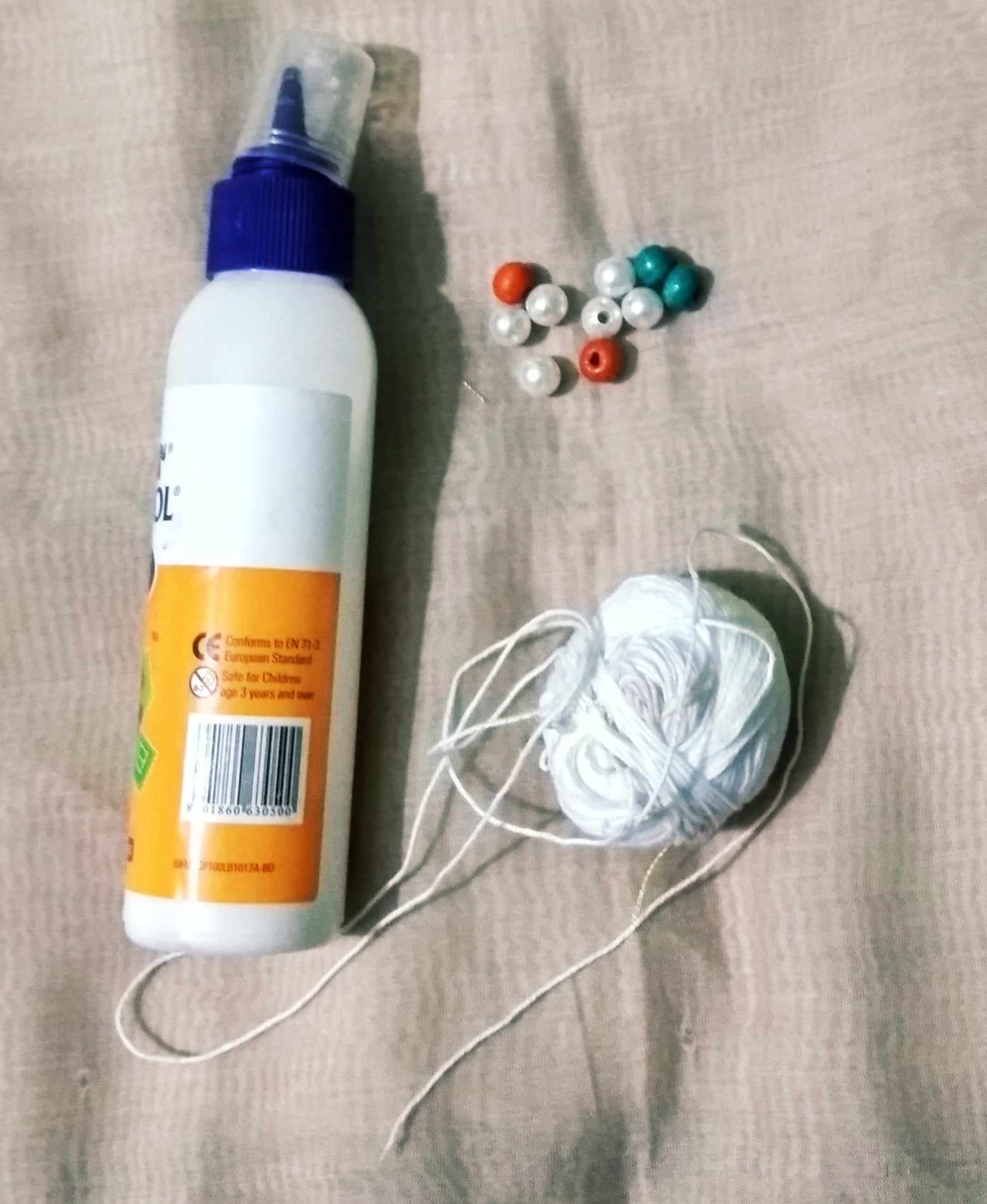 একটি মোটা সুতায় কিছু বিভিন্ন রং এর পুথি ঢুকিয়ে নিয়েছি। পুথি ঢুকানো সুতাটি পুতুলের মাথায় ঢুকিয়ে নিয়েছি।