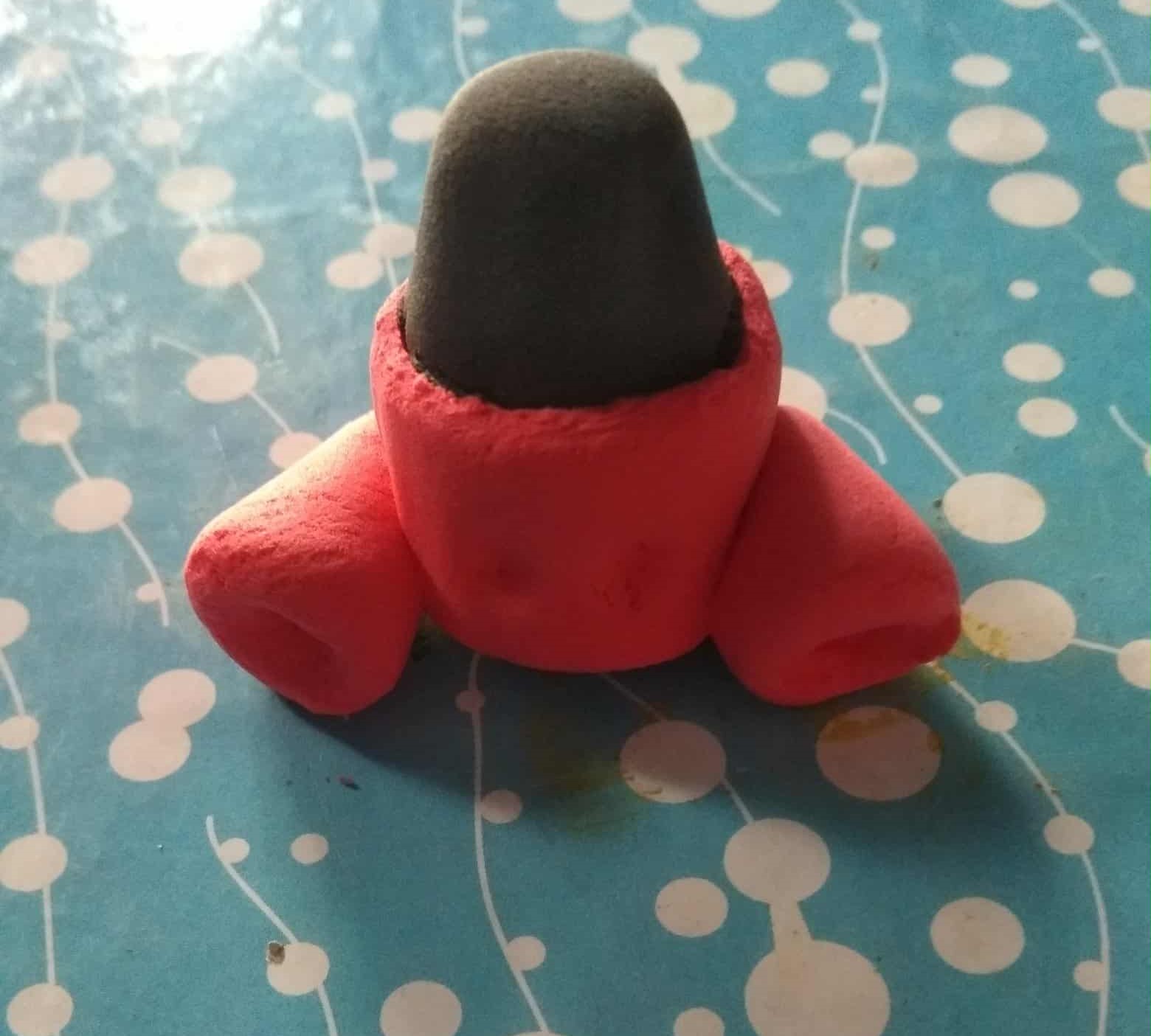 লাল রং এর ক্লে টেম্পল শেপ করে নিয়ে প্যান্ট বানিয়ে নিয়েছি। এবং মিকি মাউসের শরীরের সাথে লাগিয়ে দিয়েছি।