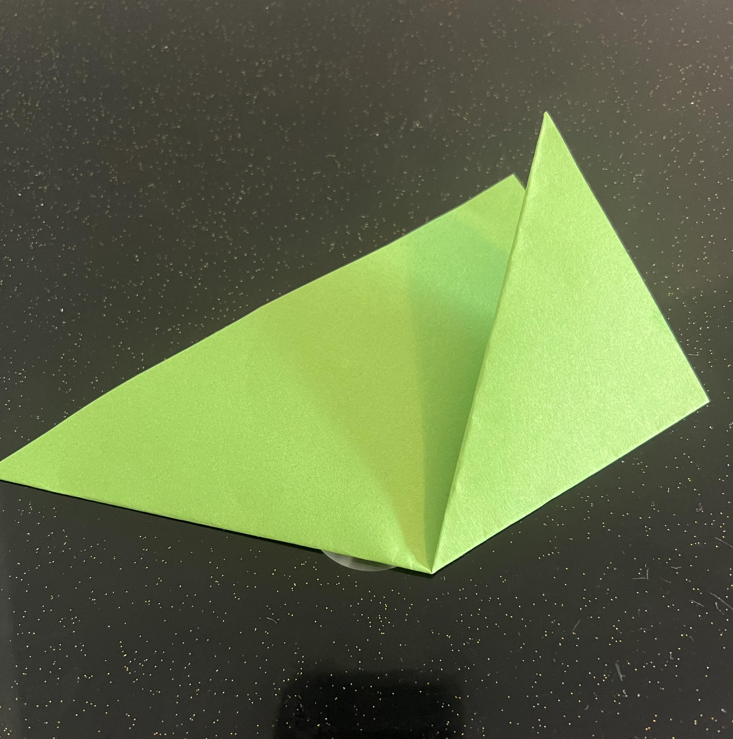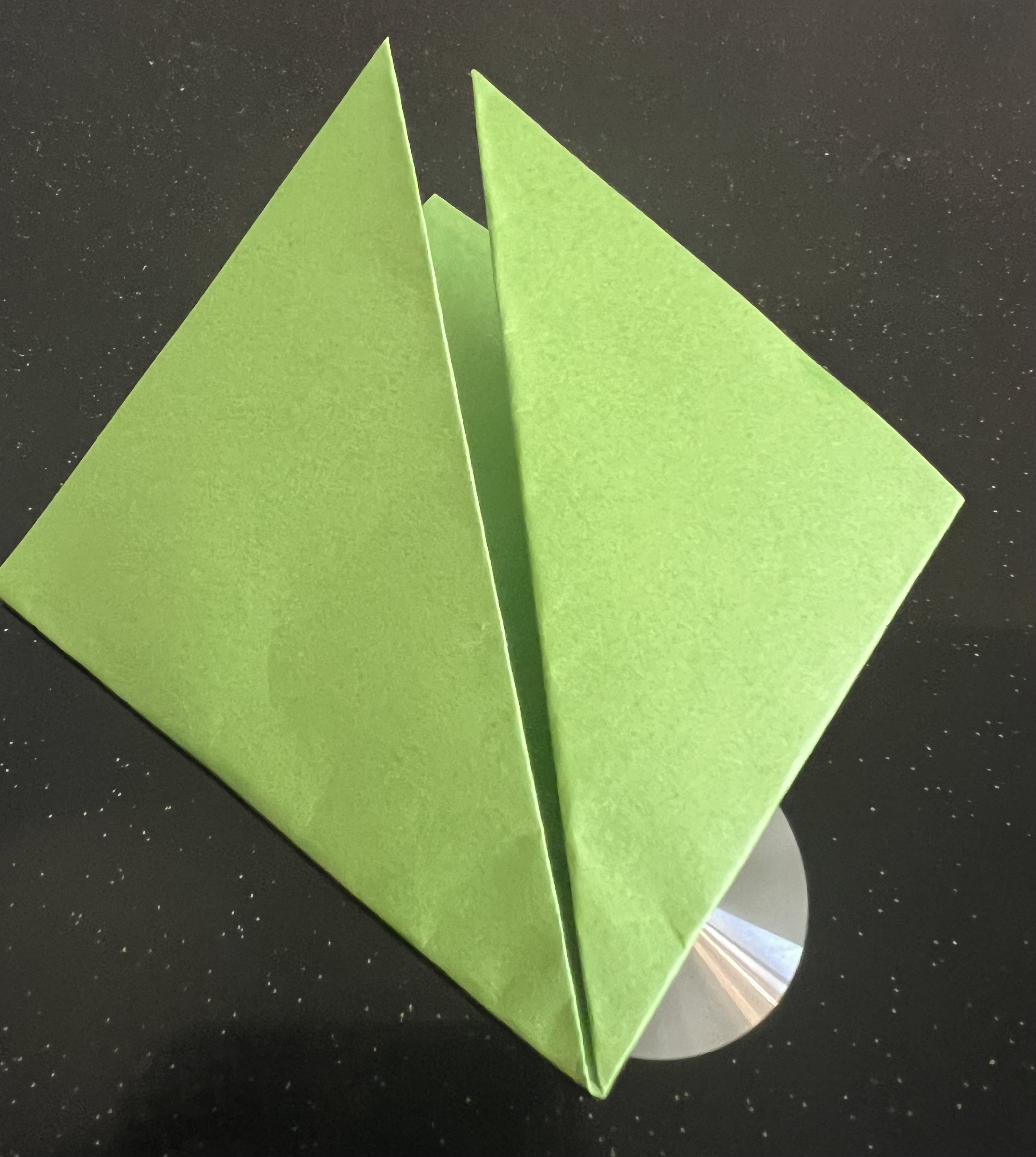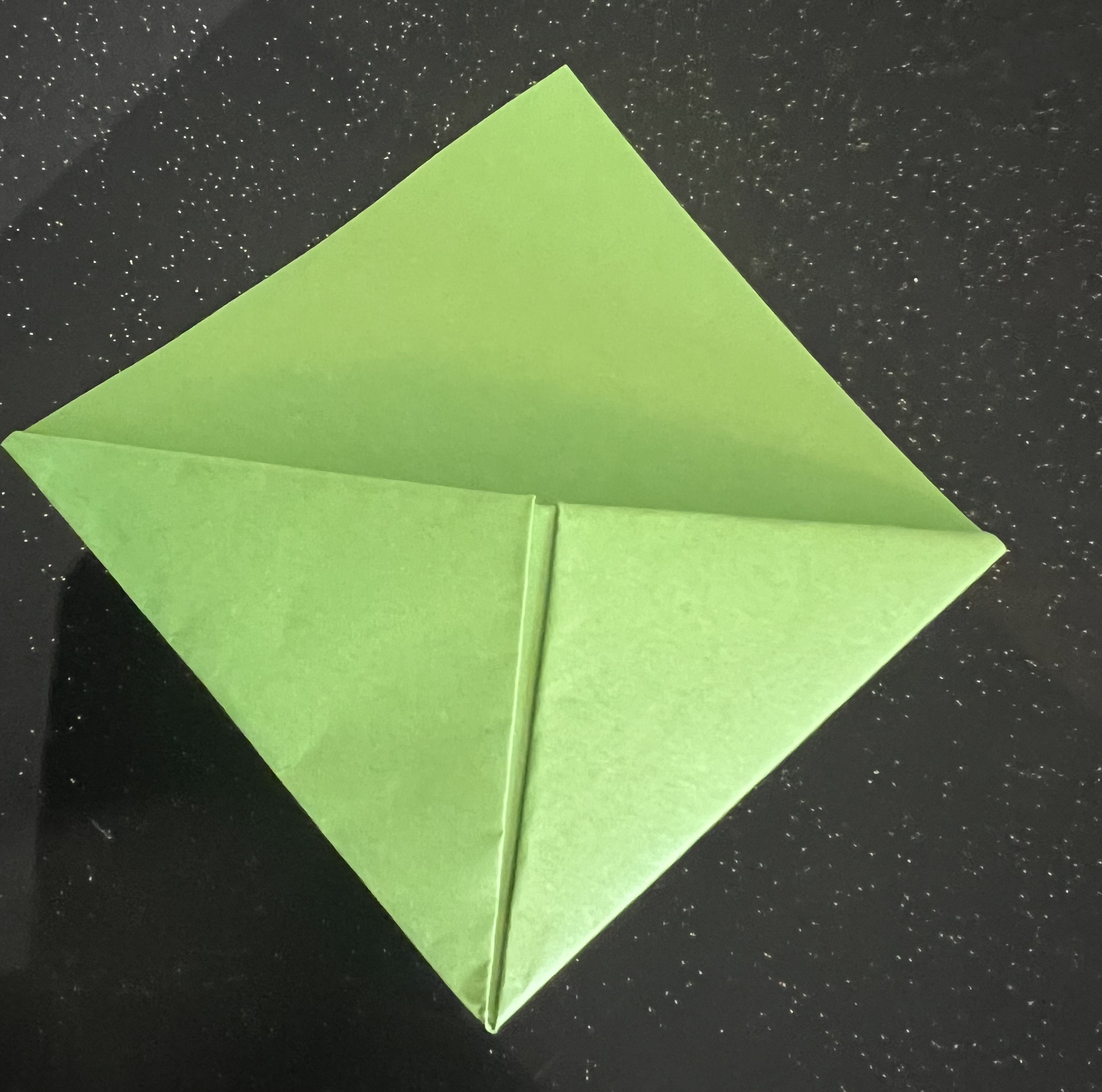 প্রথমেই একটি সবুজ কাগজ দৈর্ঘ্য ও প্রস্থে ১৫ সেন্টিমিটার করে কেটে নিয়েছি। এরপর মাঝ বরাবর এভাবে ভাঁজ করে নিয়েছি।
