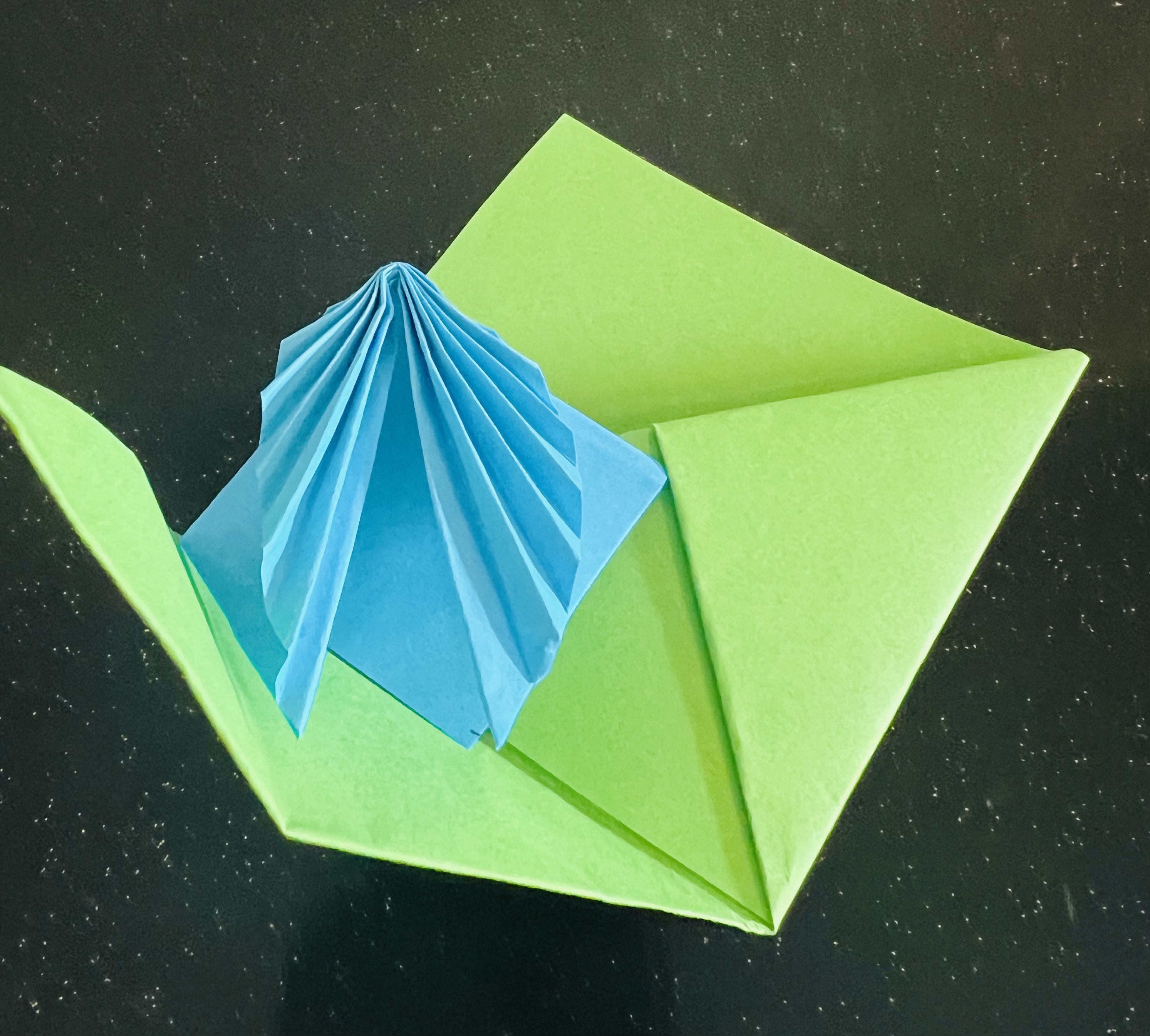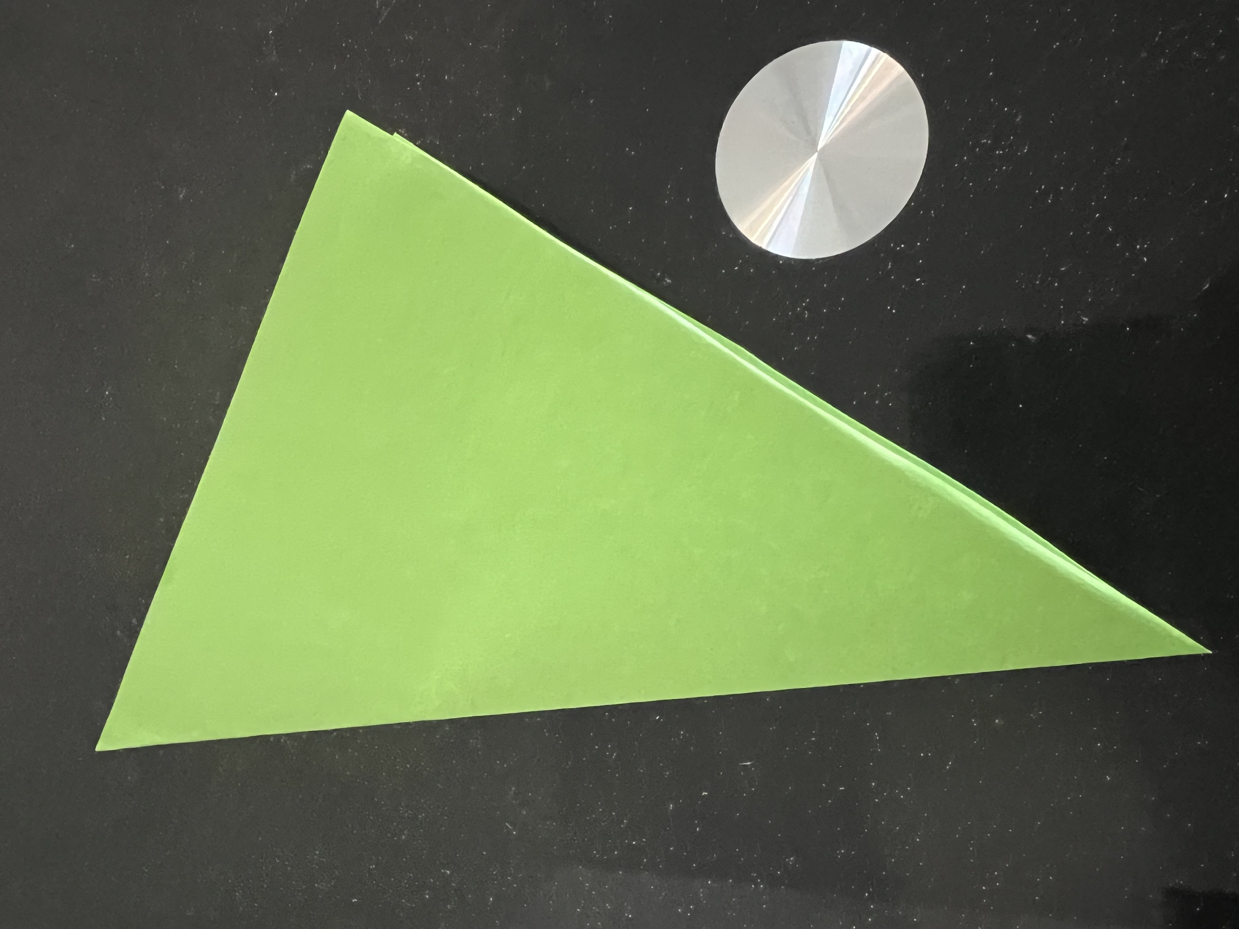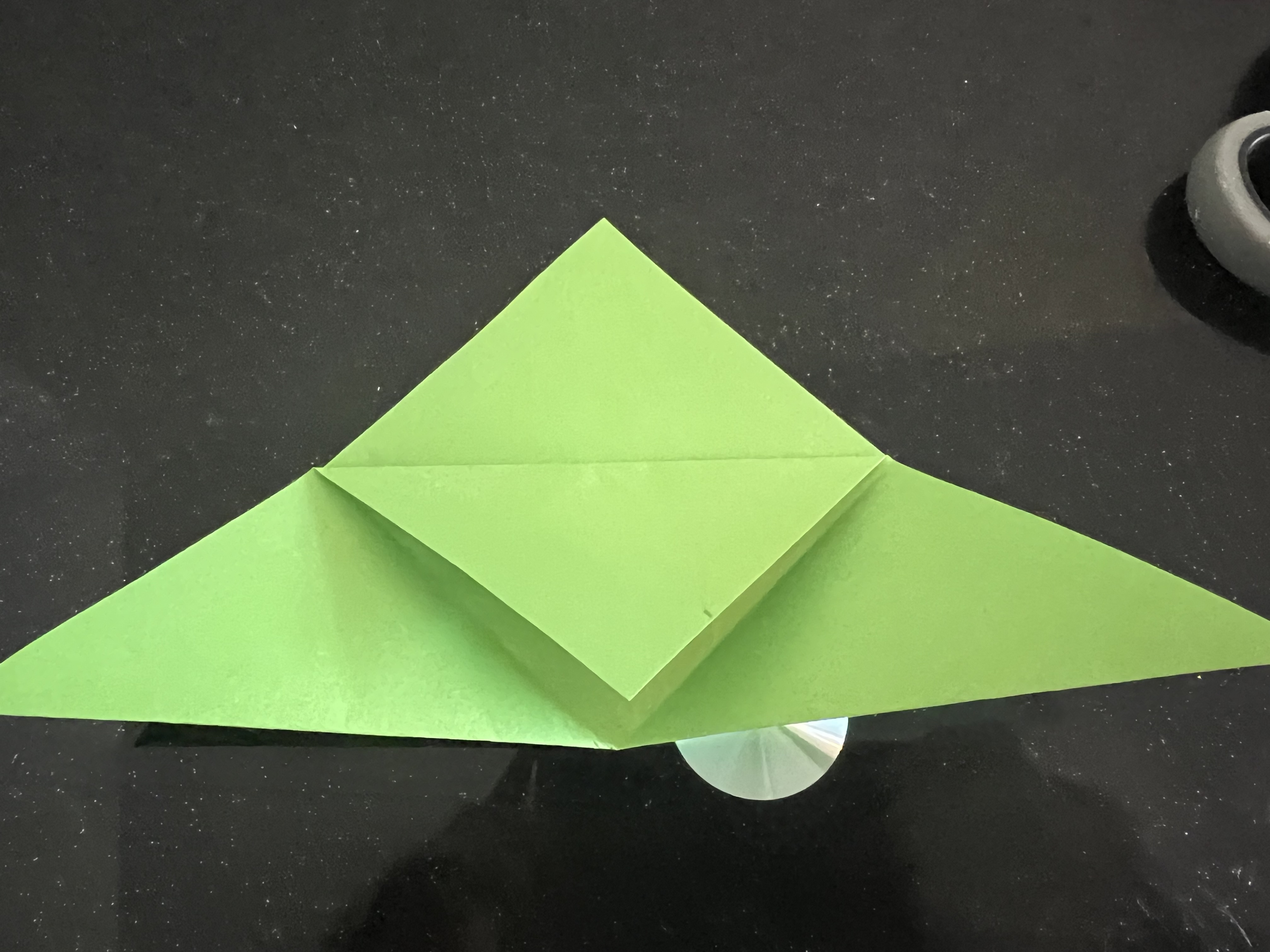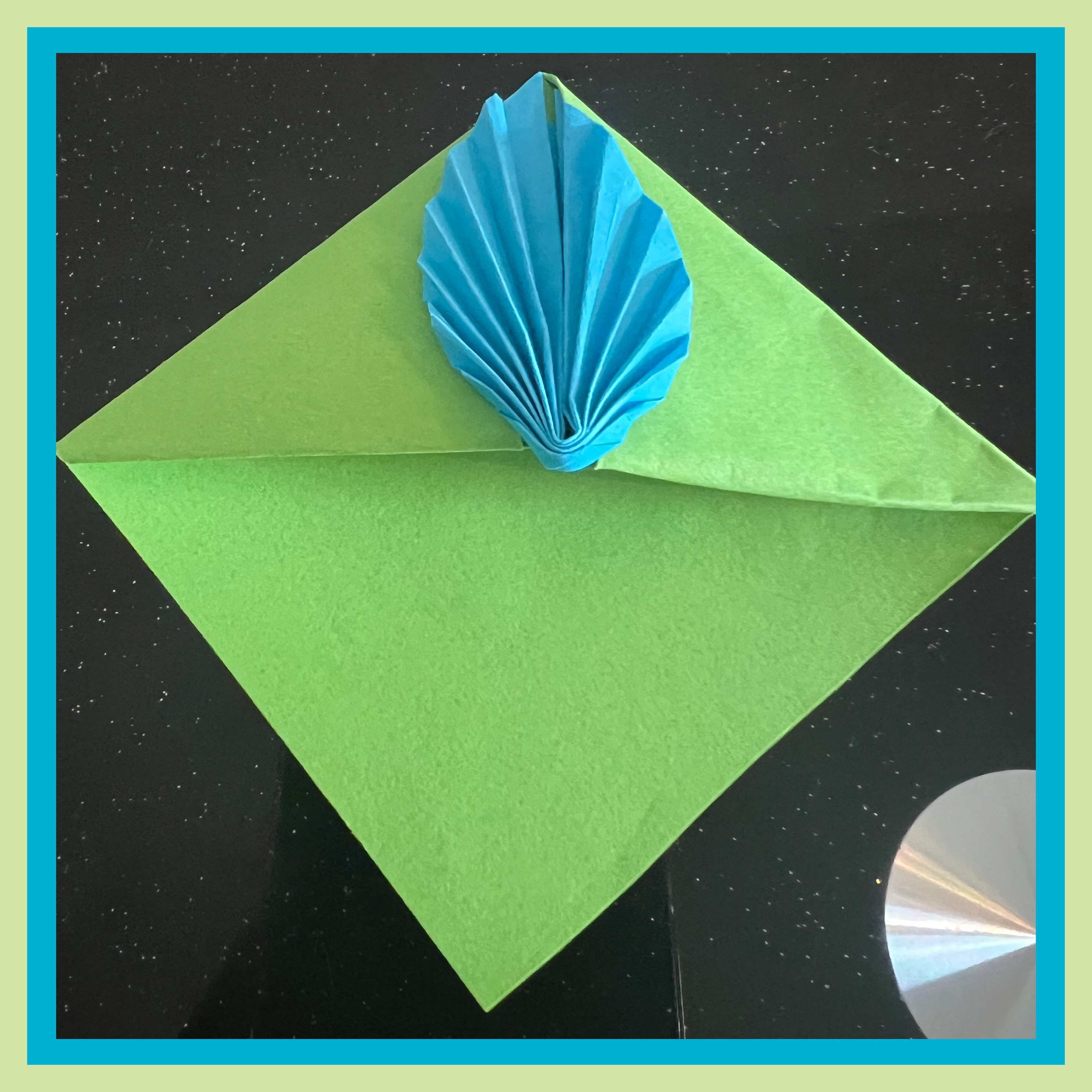 প্রথমেই একটি সবুজ কাগজ দৈর্ঘ্য ও প্রস্থে ১৫ সেন্টিমিটার করে কেটে নিয়েছি। এরপর মাঝ বরাবর এভাবে ভাঁজ করে নিয়েছি।