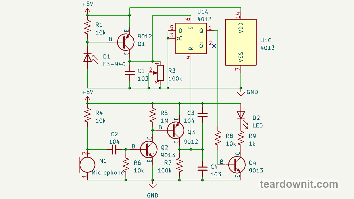 Remember we said that the CD4013 output current is enough for the LED? Here the LED is connected directly to the output of the chip.