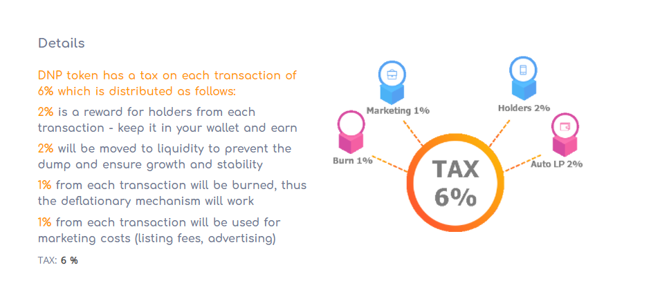 In addition to this, the DNP token also includes a per-transaction tax levy of 6%, which is shared among the holders, the liquidity and burn pool and the developer wallet, so that at the same time it provides passive income to its holders with a fair distribution. that maintains liquidity and value itself. Holders receive various benefits such as payment for services in the ecosystem, passive income, discounts, exclusive content, etc. This enables wider use and increases demand over time.