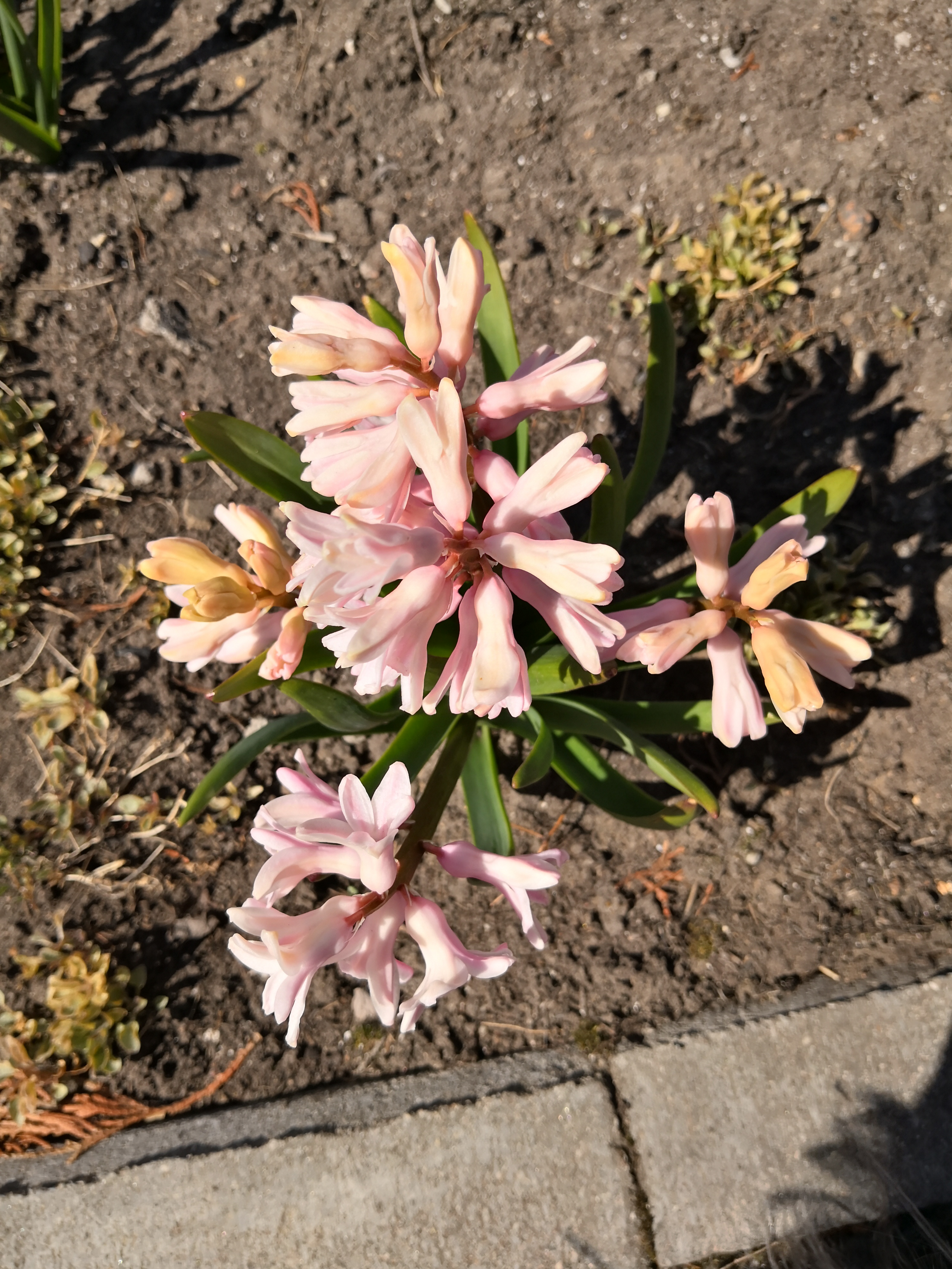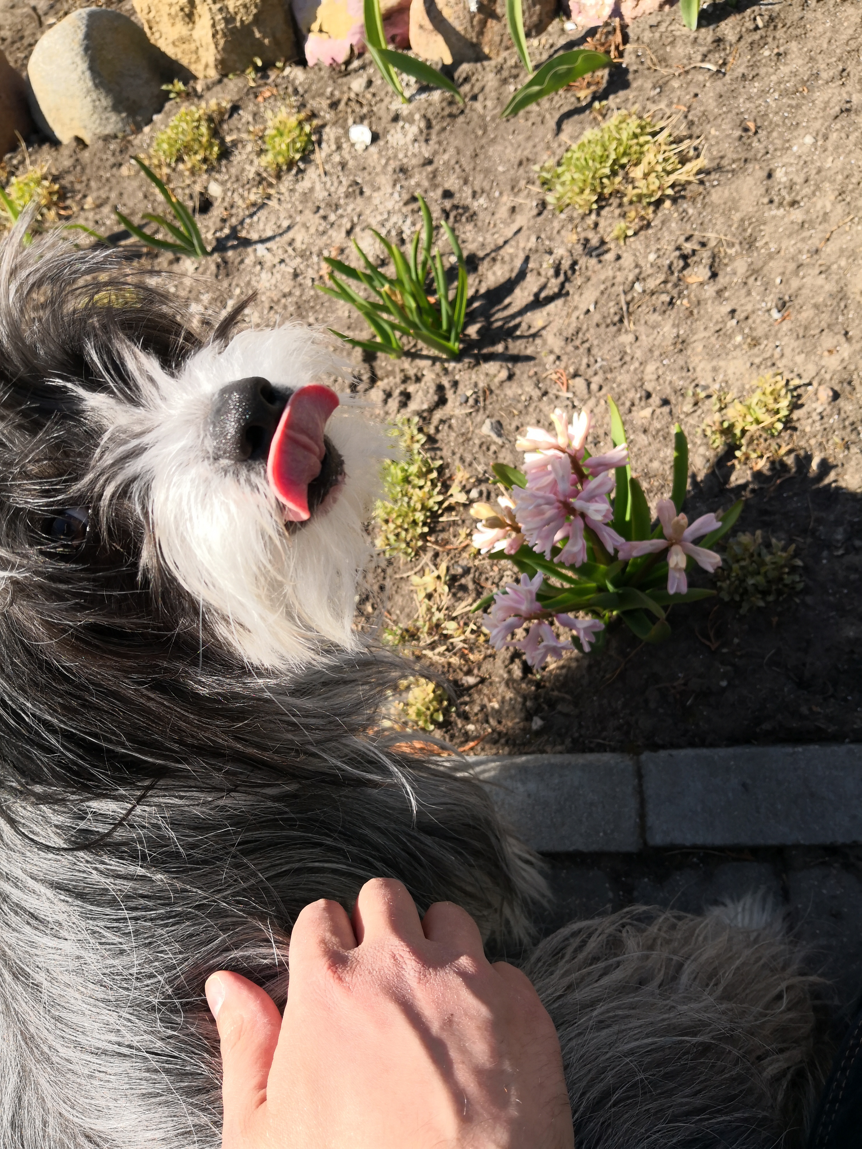 They had my brother's dog to keep them company. She is fun to be around - always looking for ways to lick you. It's very hard to take her picture - she moves so fast. Luckily this photo was taken next to hyacinth which blossoms so nicely in my parents garden. I could look at it for hours.