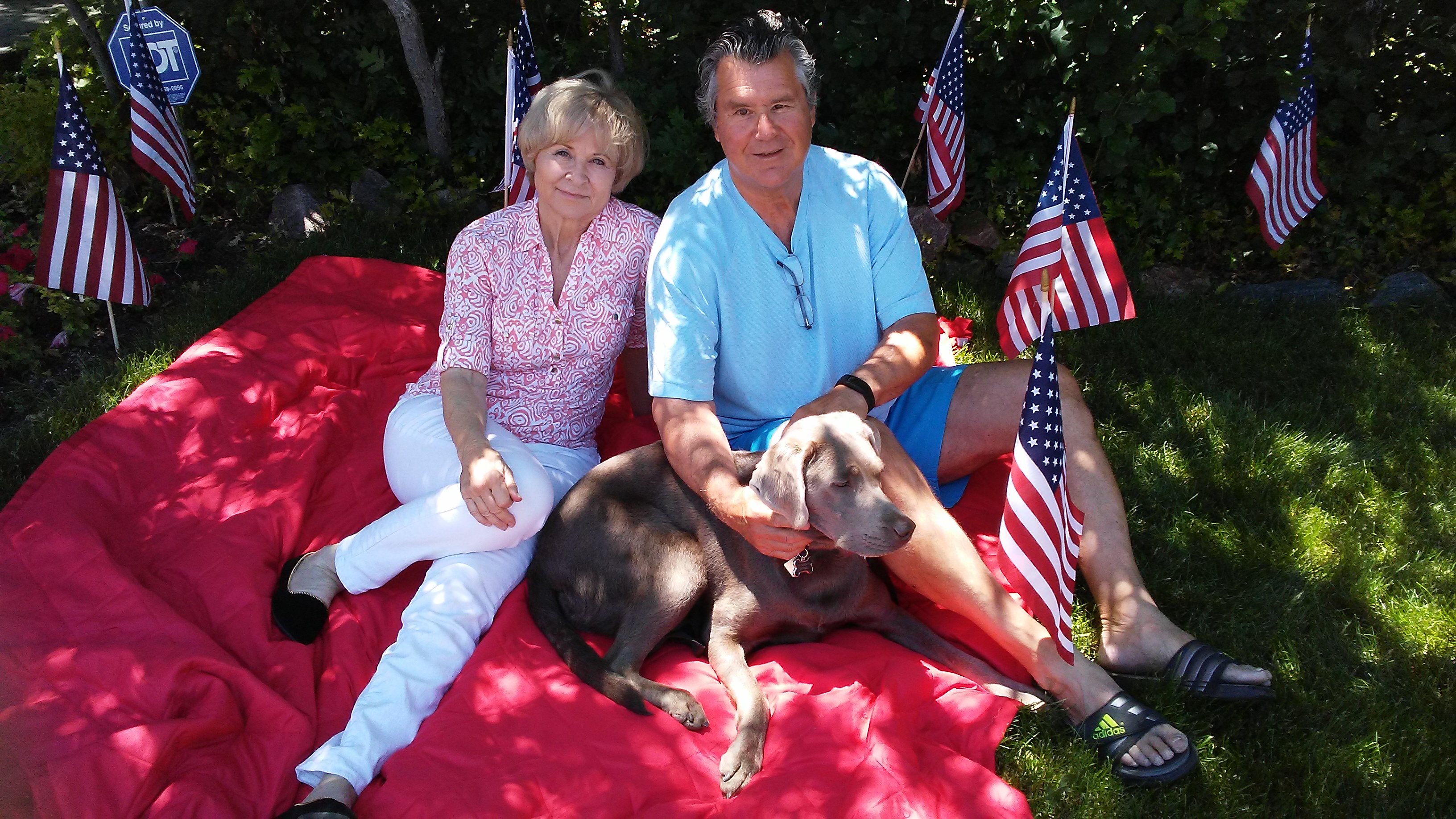 We are getting ready to celebrate Independence Day, July 4th, around here and thought I'd take a minute to enter this photo in the #dogsofsteemit no.77 sponsored by @Supernovastaffy. This is Parker, a silver lab, that we were dog-sitting and within 24 hours ended up at the emergency vet hospital after he ate rat poisoning. That was a night to remember...don't have any photos so you'll just have to imagine getting tubes of charcoal down this one year old's throat every couple of hours through the night. But all went well and we have a happy ending.