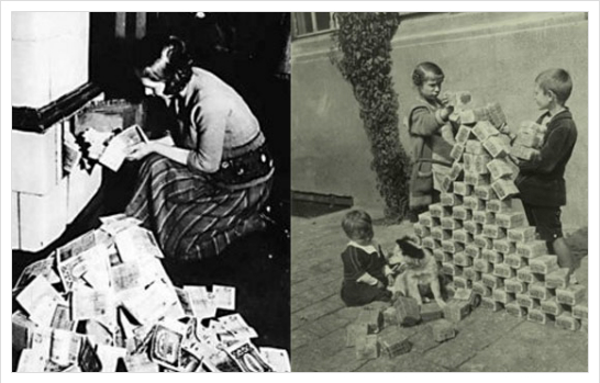 1922년부터 1923년 사이에 독일의 전신인 바이마르 공화국에서 발생한 하이퍼인플레이션의 모습이다. 당시 독일의 중앙은행인 제국은행(라이히스방크)에서 발행한 골드마르크가 장작, 벽지로 이용되고, 아이들의 블럭쌓기 놀이에 사용되었다. 심지어 빵을 사기위해 수레로 화폐를 옮기는 도중에도 물가가 가파르게 상승해서 미리 이동중에 발생할 물가상승분을 더해서 수레에 화폐를 실기도 했다.