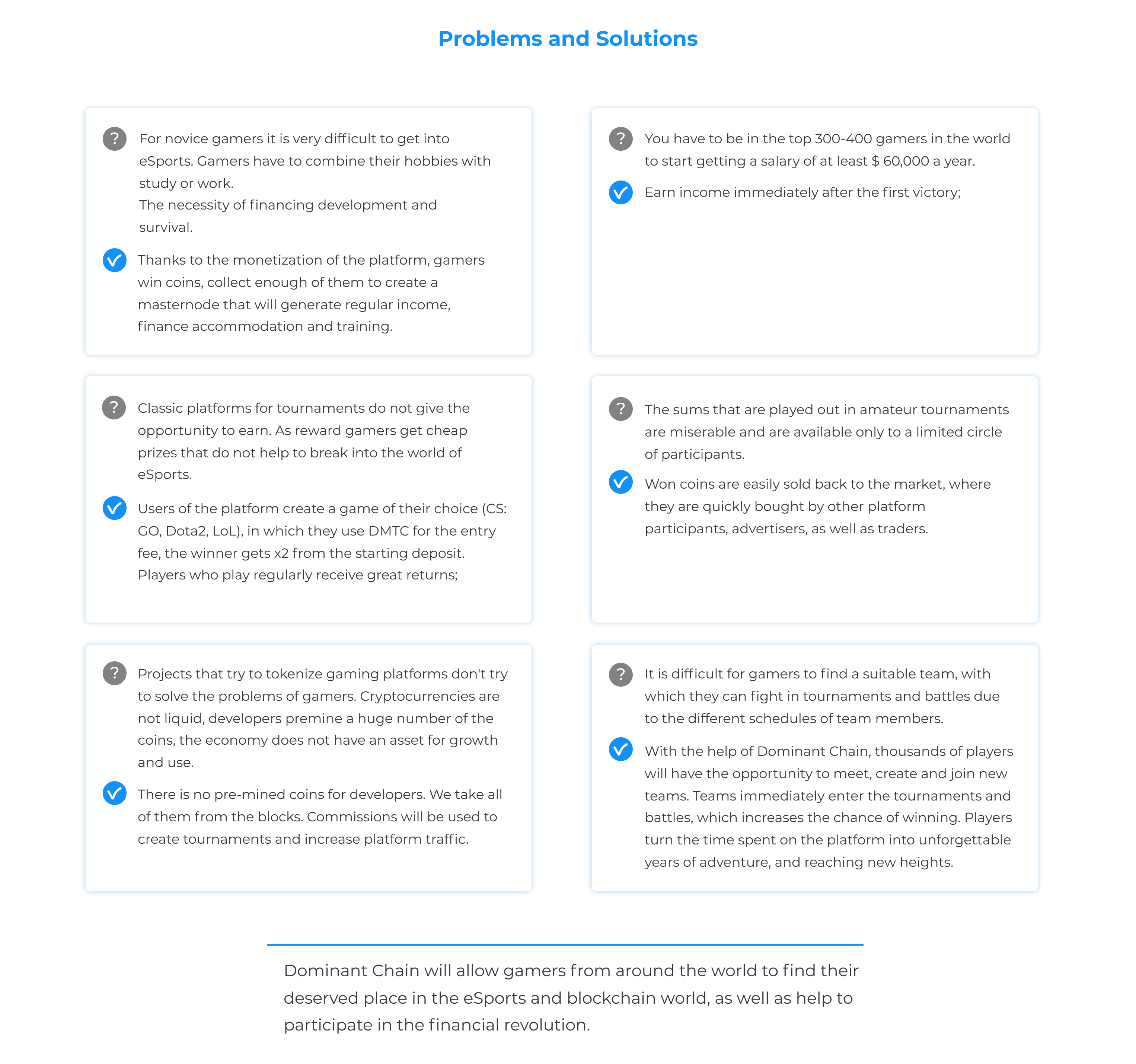 Dominant Chain platform and Dominant Coin will break new ground in eSports and cryptocurrency industries. We strive to fill a unique business-niche by providing multifunctional, secure, decentralized gaming application empowered by a crypto coin for beginning and casual players.