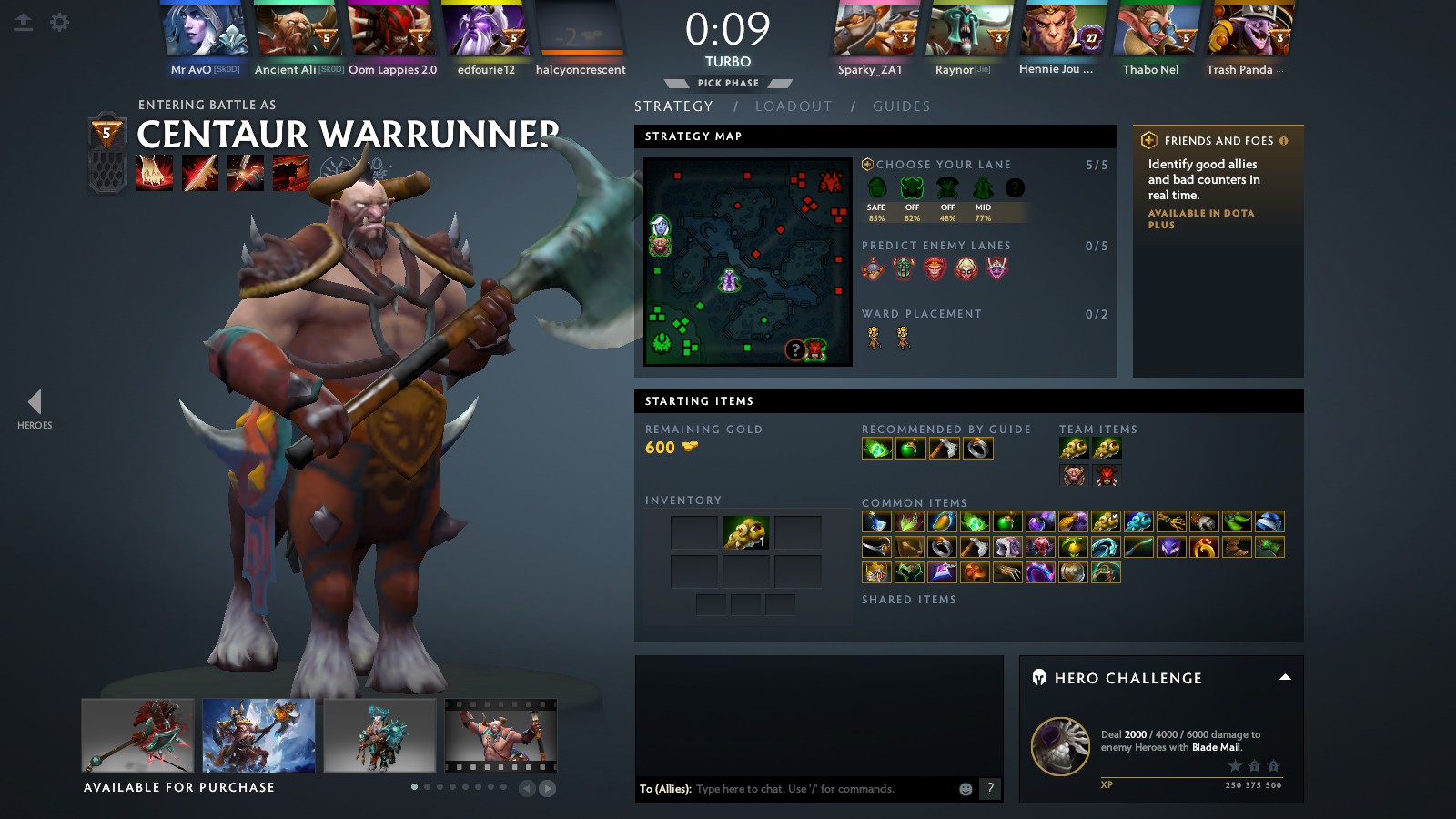 5 on a team, 2 teams, can see Centaur Warrunner back left, a tanky strength hero, key abilities are return damage and to help the pick and escape team fights