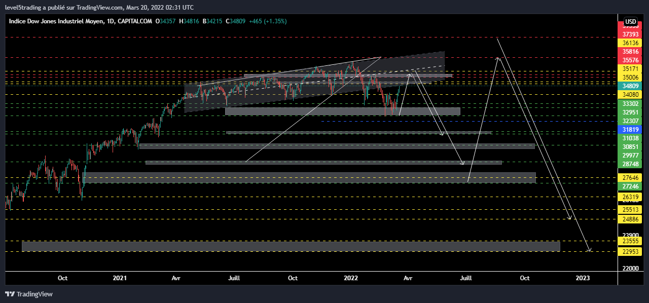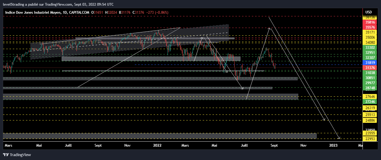 Update and follow-up of the Dow Jones stock, two of the strongest bearish patterns have been formed, the price channel pattern has been broken, as well as the rising wedge supported by the drop and free fall, and they have been retested.