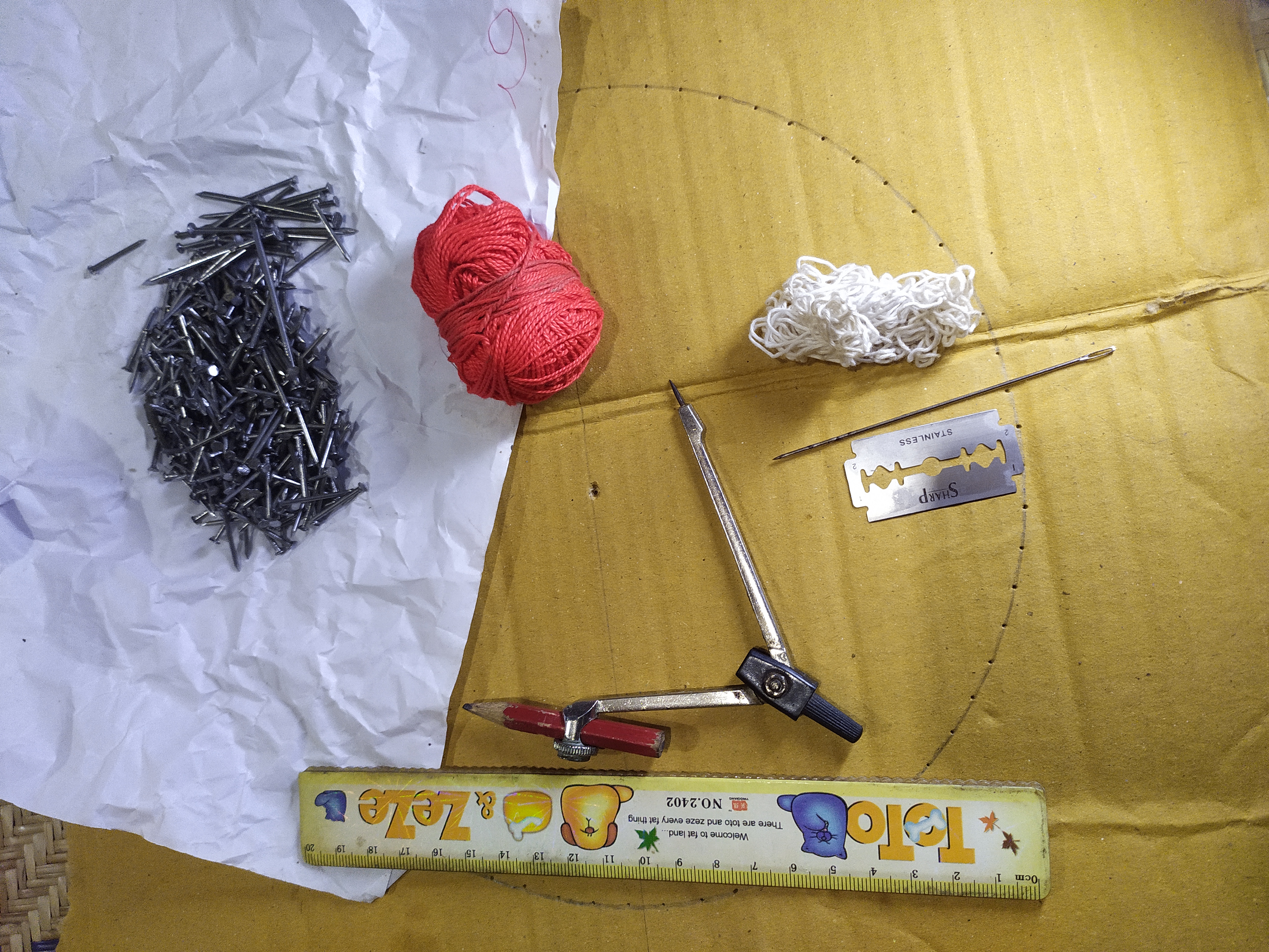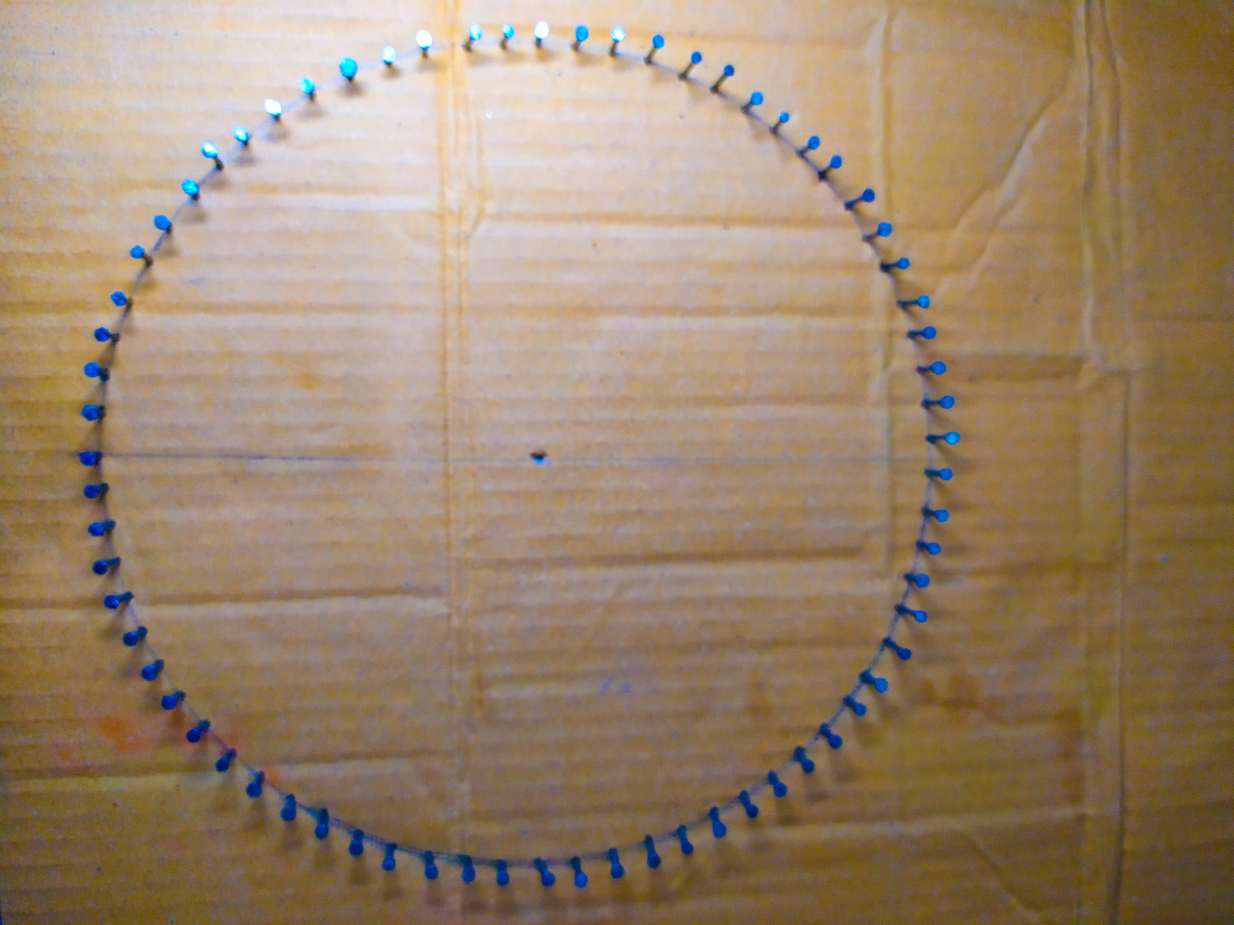 I first drew a circle 11.5 inches from the original center with a compass on colored paper. The paper is then placed on top of a piece of wood leaf with gum.