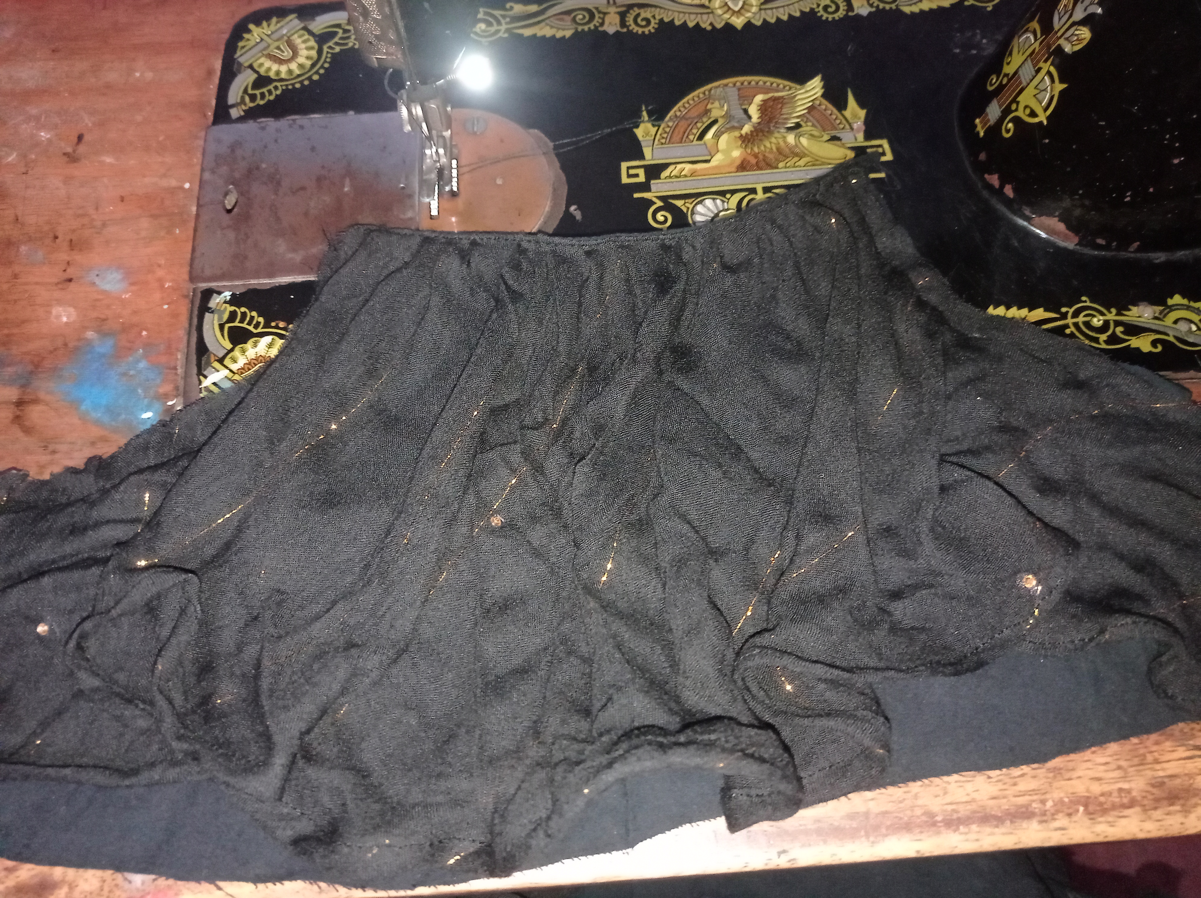 প্রথম অংশটা একদম কুচি করে সেলাই করে নিলাম। কুচির নিচের অংশটা সমান ভাবে ভাঁজ করে সেলাই করে নিলাম।
