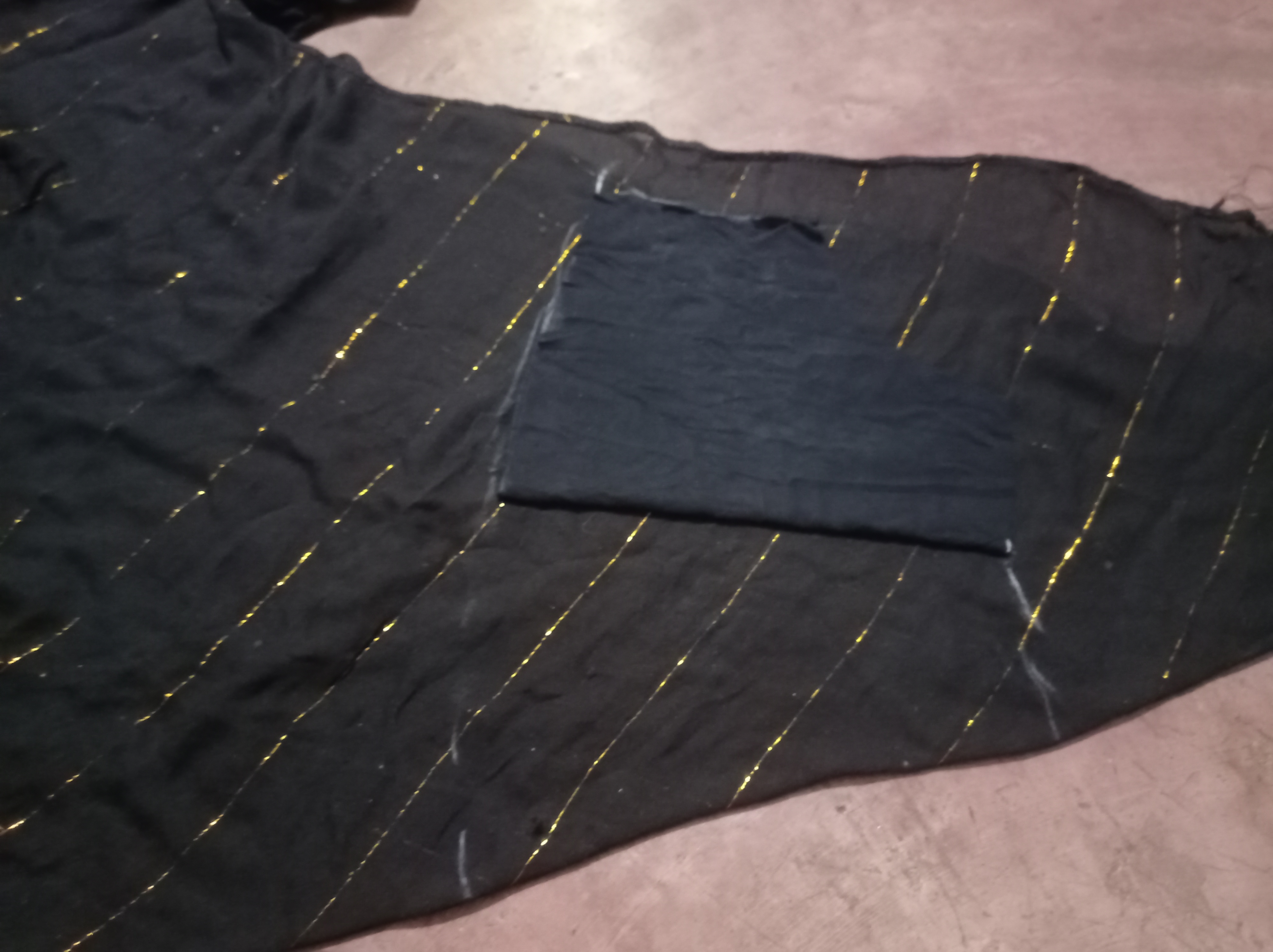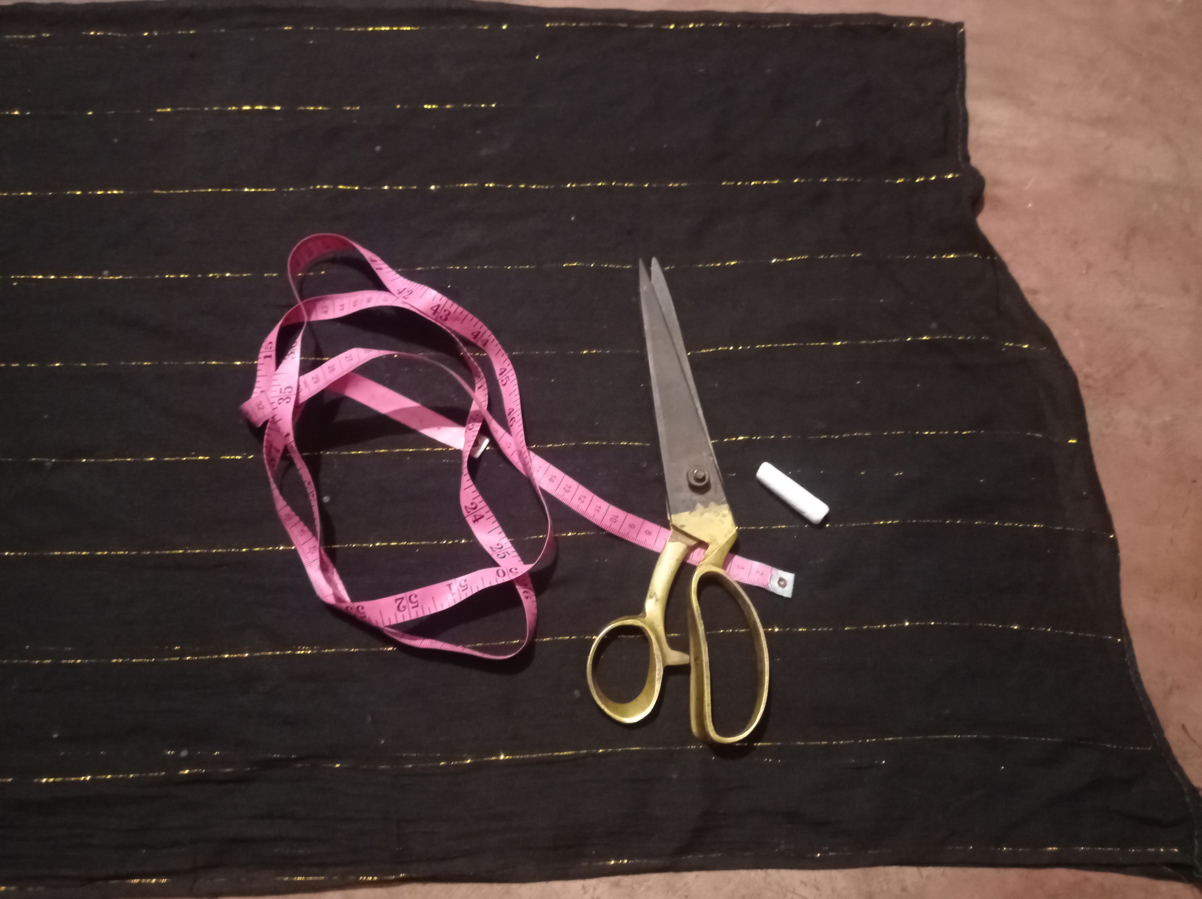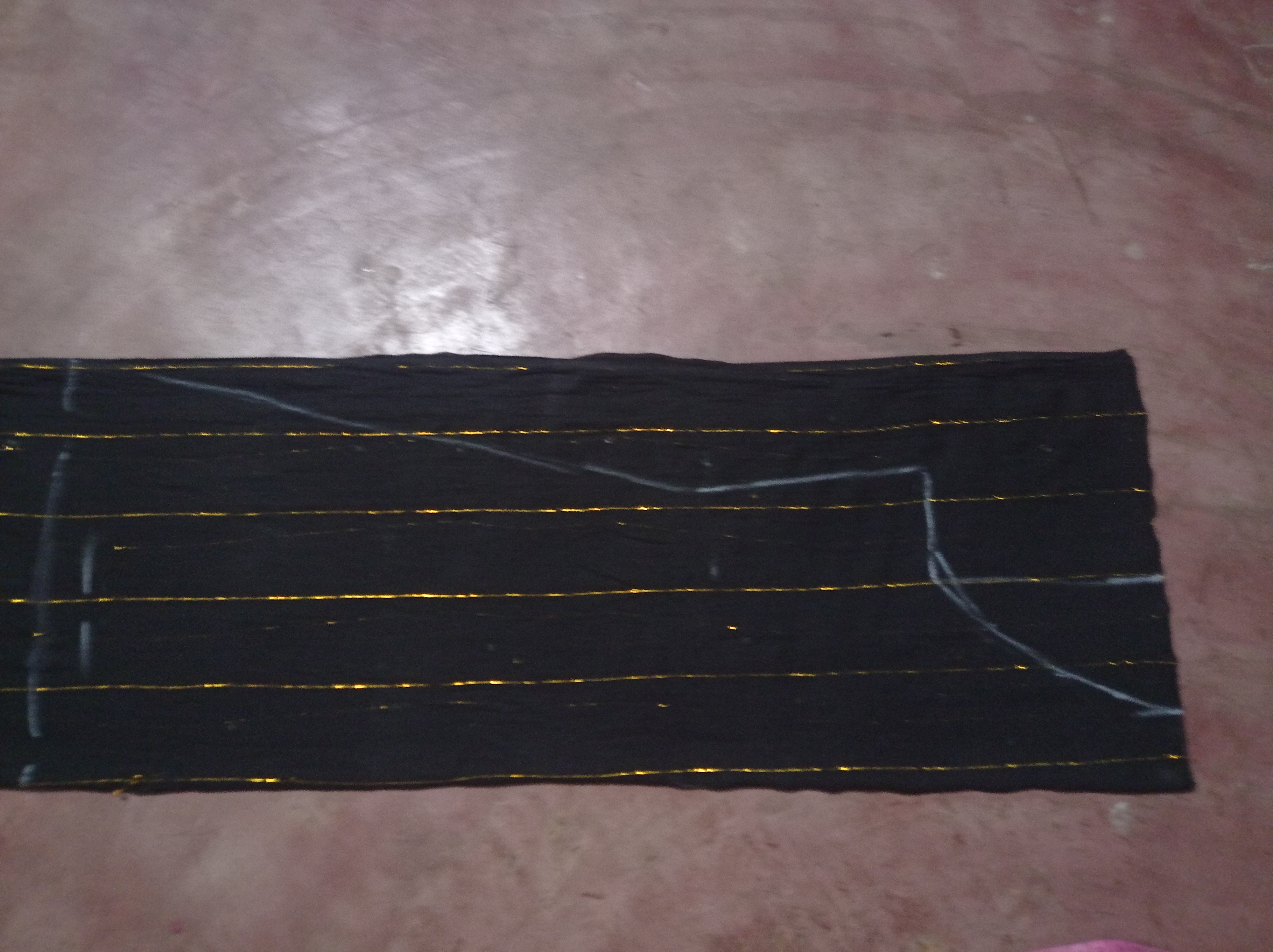 প্রথমে আমি একটি কাপড় নিলাম। এরপর কাপড়টাকে চার ভাঁজ করে নিলাম। এরপরে আমি জামার মাপ নিয়ে জামার উপরের অংশটা কেটে নিলাম।