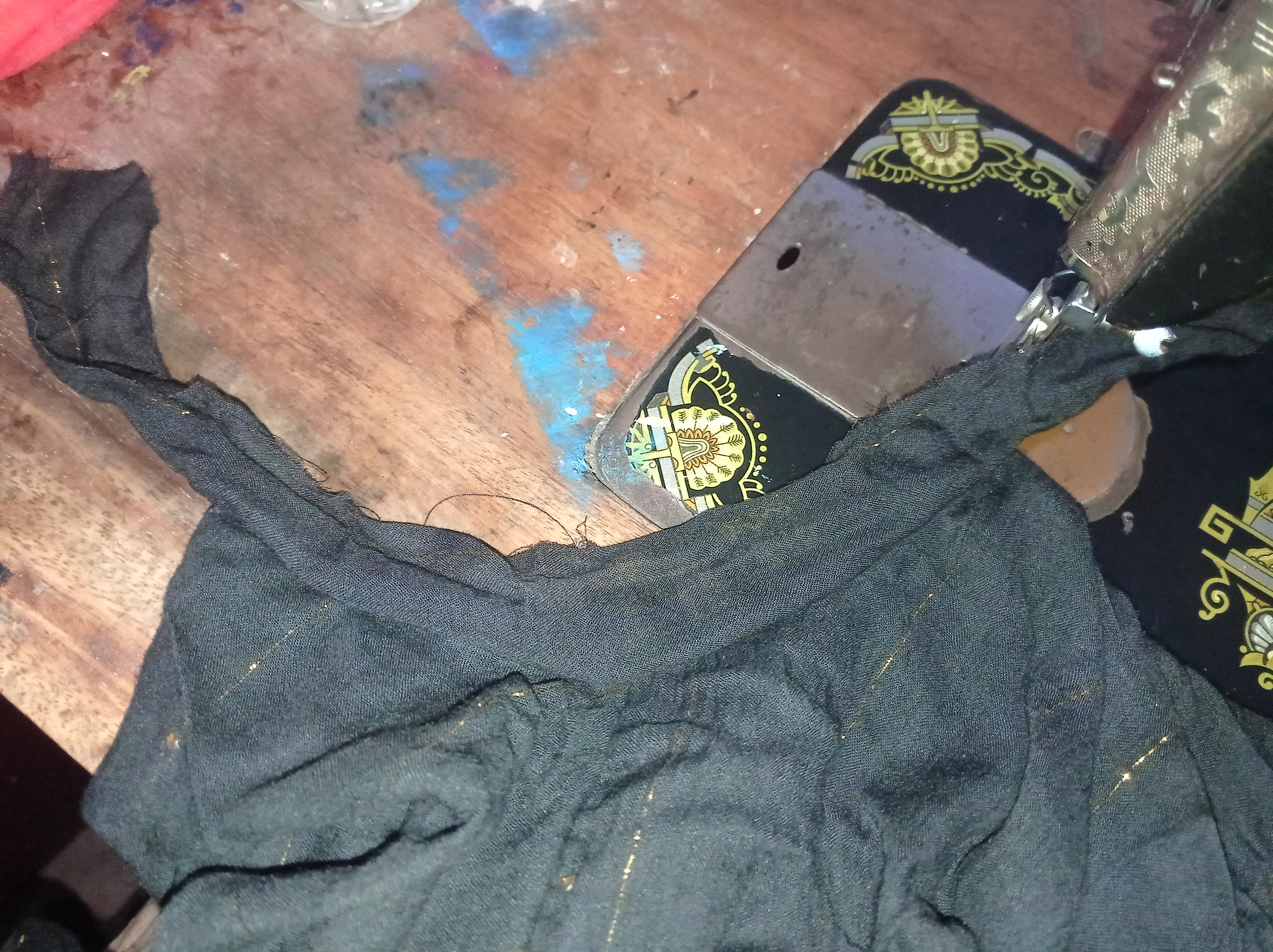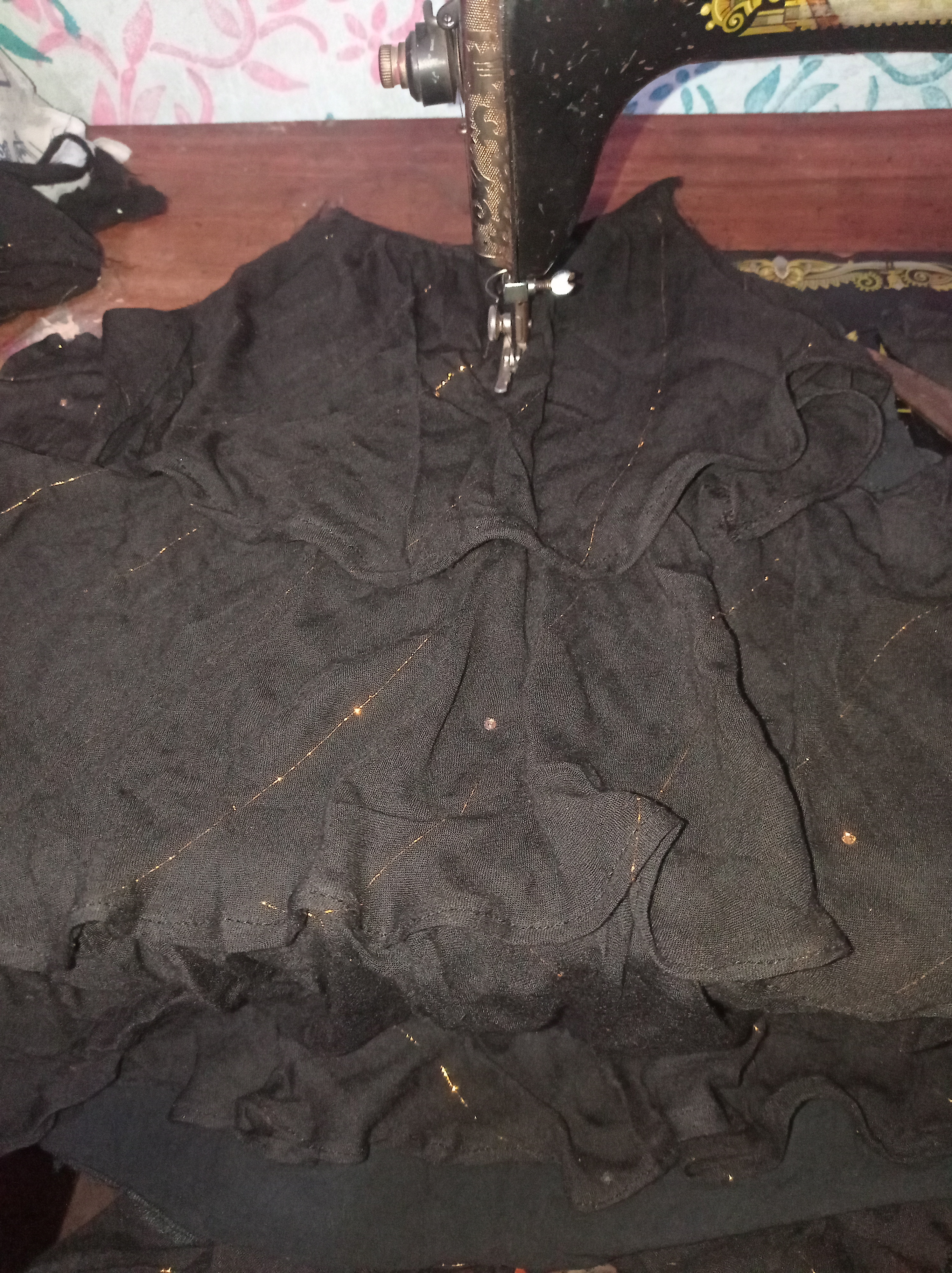এরপর আমি প্রথমে উপরের অংশটার মধ্যে কুচি করে সেলাই করা শুরু করি।