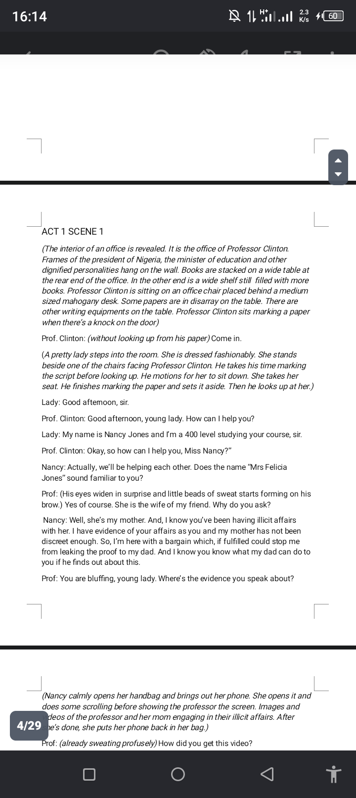 In this project, we had to write the script, scout out locations for the movie, settle our welfare and all that. I have never written a movie script before but since I have writing experience on other stuffs and I was probably the best writer in the group, I volunteered to write the script. We brought up an idea for the movie and I developed it into a script. It was my first time and i had a tight deadline. I was almost stretched to the breaking point but when I was done, I was proud of my achievement. Here's a screenshot of a page of the script.