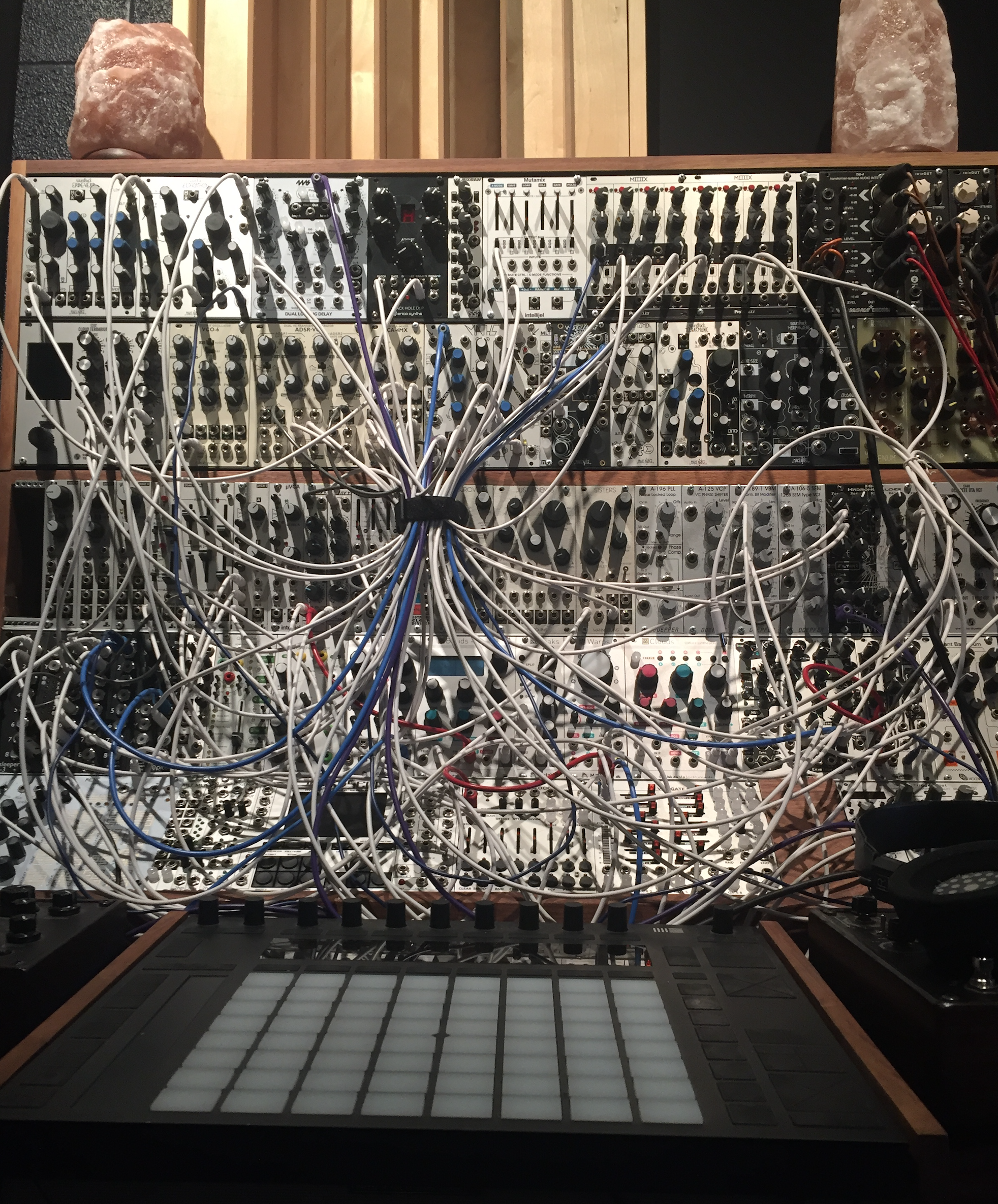 For the synth heads: I took a break from hardware synthesis to get this more compositional piece down, writing and sequencing it with the Push 2 and Ableton driving the Expert Sleepers FH-1 midi-> cv converter. I did, however, still manage to work the Make Noise Rene and Trigger Riot sequencers into the patch. Ableton is sending clock o the sequencer array, and the Rene is doing a rad eight step pattern triggering specific modulations to the E352 techno super saw that comes out guns blazing when the drums enter. The Synthesis Technologies E352 is a INSANE BEAST. Every time I'm listen to half a track and am stuck on where to go with an overdub, a quick sweep of the wavetables / wavefolder / stacked oscillators on that thing and I'll find something totally unexpected. Other highlights include a bitcrushed beat i'm bringing in and out courtesy of the Doepher bitcrusher and SEM filter. The shhhhhhriek noises on the four panned hard left are courtesy the fabulously weird and inspiring Noise Engineering Loquelic Iteritas Percido ... which I am only just getting a handle on after a month or so with it in the fold.