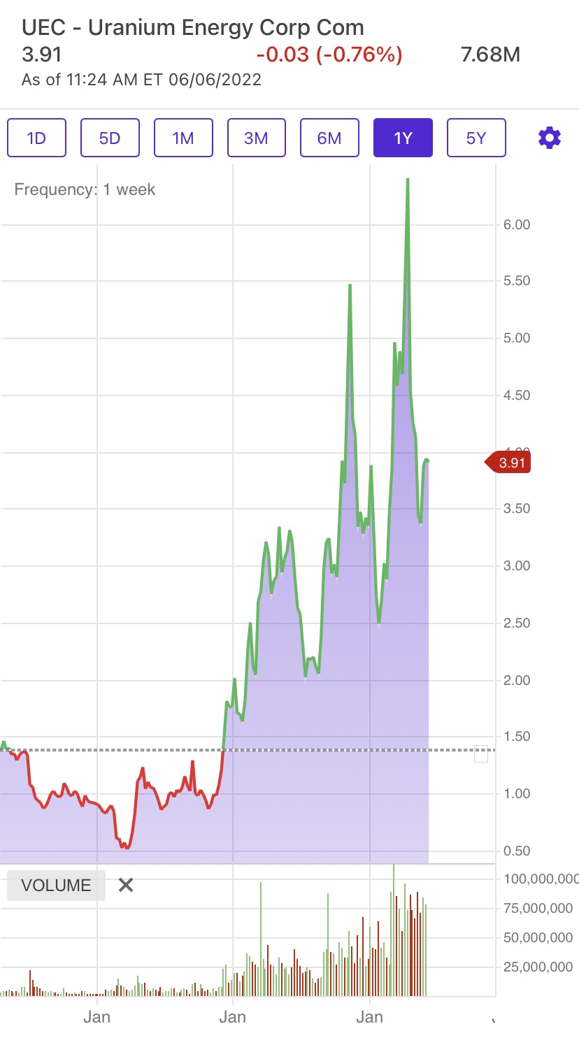 The only wildcard stock I’m holding is UEC. Uranium play. I’ve held a position since 2016. I’ve sold and bought back over the years but always had some. Took a lot of the table at $5.00 & $6.00 and now I ponder should I buy more since my position is smaller. We shall see. But I’d hold a small position and dollar cost average a bit, I think it could be a $25.00 stock some day. I could be totally wrong though so this is not trading advice! Gotta love this chart though! I pulled it back so it’s about 3 years not 1 year chart.