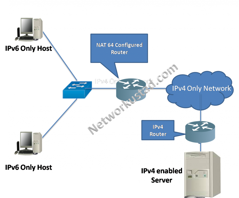 The figure below illustrates the translation method. Network Address Translation 64 (NAT64) allows IPv6-enabled devices to communicate with IPv4-enabled devices using a translation technique similar to NAT for IPv4. An IPv6 packet is translated to an IPv4 packet and vice versa. It allows IPv6-only clients to communicate with IPv4 servers using unicast UDP, TCP, or ICMP. One or more public IPv4 addresses assigned to a NAT64 translator are shared among several IPv6-only clients.