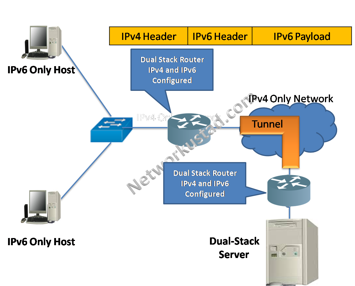 Tunneling is another method of IPv4 and IPv6 co-existence. In tunneling IPv6 packet is transporting over an IPv4 network. The dual stack routers encapsulate the IPv6 packet inside into the IPv4 packet, just like the router encapsulates other data into IPv4 packets. We can communicate using tunneling method, with isolated IPv6 networks without upgrading the IPv4 infrastructure. We only required tunnels configuration between border routers or between a border router and a host however, the important point is that both tunnel endpoints must support both IPv4 and IPv6 protocol stacks. We can configure tunneling either manually or dynamically. The important methods for tunneling are listed below. The figure below illustrates tunneling:-