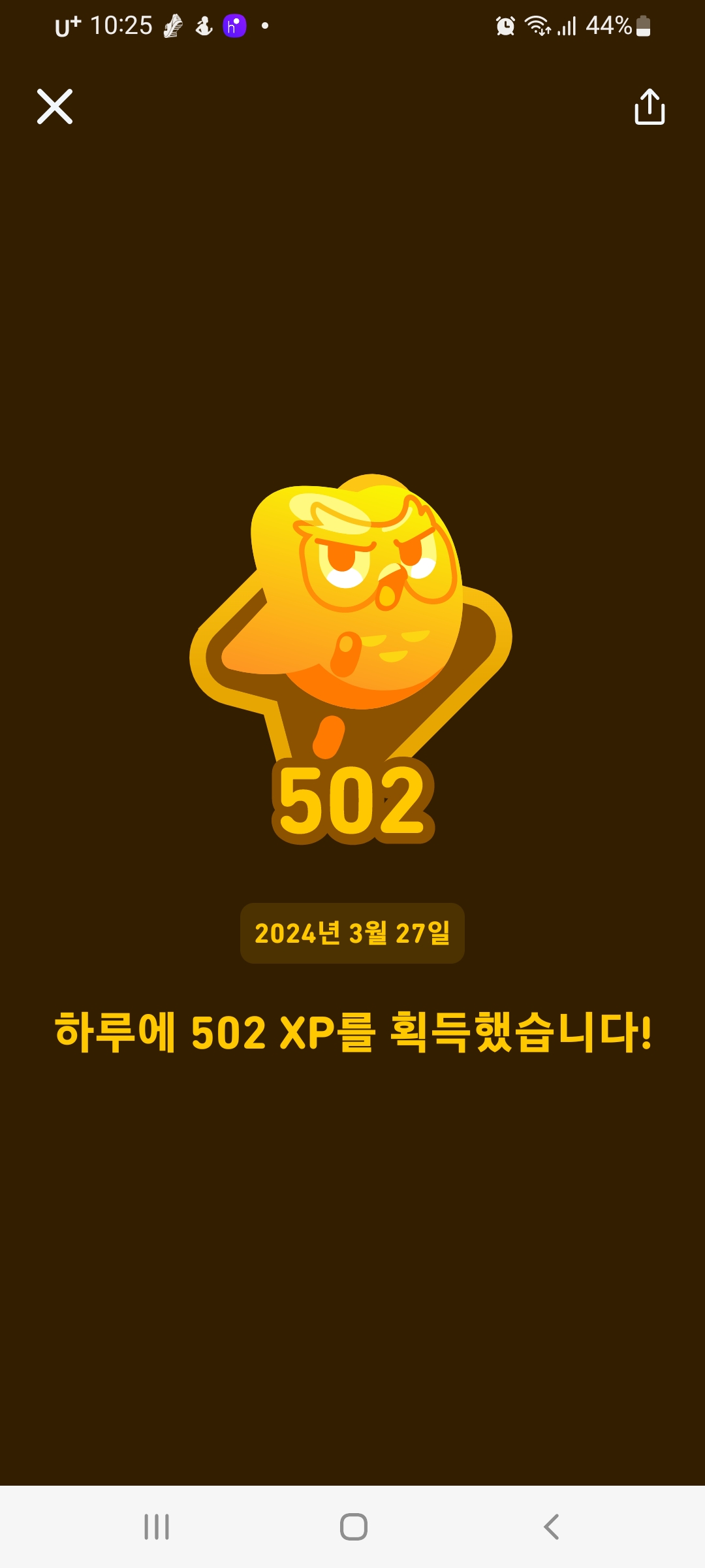 듀오링고, 불태웠다!!!smilejy (53)in #duolingo • 2 years ago 요즘 영어 앱 듀오링고를 2~3분 가량 매일 하는데 어제는 50분 가량을 했다. 15분 동안 2배로 점수를 준다는 유혹에 자꾸 넘어가 일별 최고 점수를 획득!!! 점수의 노예가 되었지만 영어를 50분 공부했다는 뿌듯함으로 하루 마무리~~ ㅎㅎ