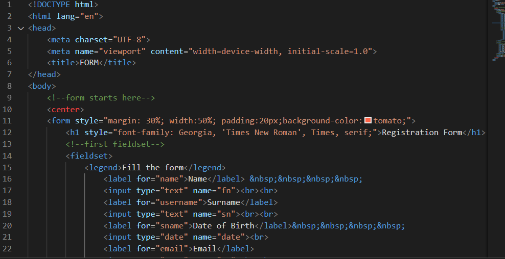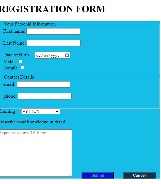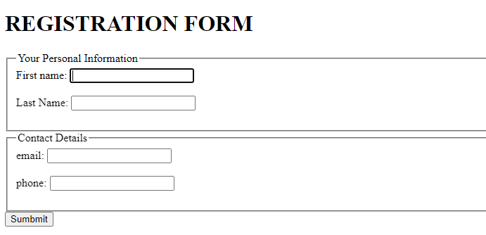 First of all your presentation is good that is making code easy to read. Your registeration form is also looking good. One thing I suggest is to add a little padding in left side of form to make space between content and border. But as its our first lesson we all are improving from day one. I hope that till end of this lesson season we will master web development skill.