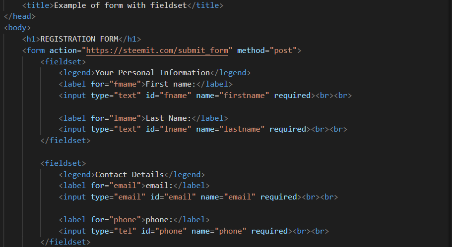 A <fieldset> tag in HTML is the tag that is used to group elements that are related to a form. The tag is used along with the <legend> tag which can be seen in the screenshot which is an example.