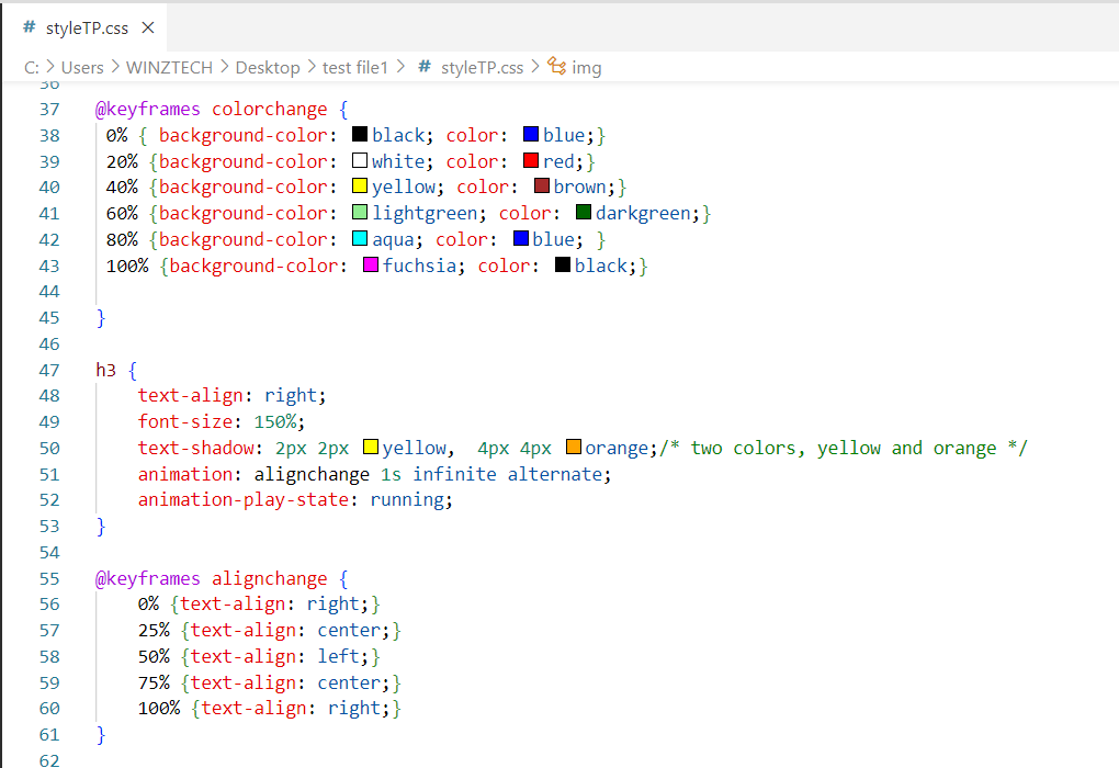 An animation allows me to change the alignment of the last title. This title is initially right aligned with a yellow color shadow and an orange color shadow, with font size of 150%. The animation allows me to change the alignment in three intervals as follows: right then center then left. The animation lasts 1 second and loops alternately 30 times.