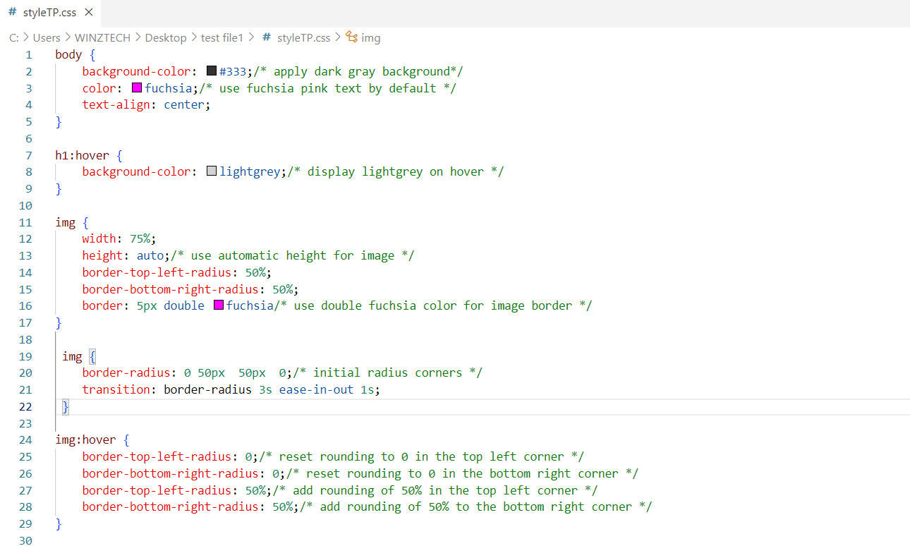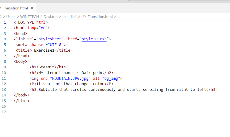 I will start by creating two files, HTML language and CSS language. Using the guided quotes for the HTML5 program, I was able to reproduce A document with name "transition.html." And another one in CSS language with name styleTp.css.
