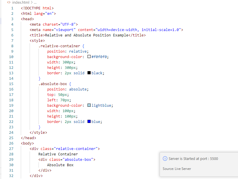 • Relative: Elements are positioned relative to their normal position. Adjustments are made using top, right, bottom, and left properties.As the example code I have shared my relative-box element will be positioned 20px down and 30px right from where it would normally be. The space it originally occupied is still preserved in the layout, so other elements are not affected by the move.