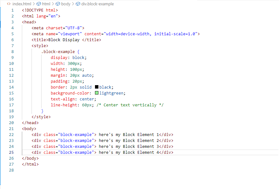 To demonstrate block display, I created 4 blocks. As mentioned, in block display, elements are aligned vertically. The first block appears at the top, and the rest are displayed below it. I added colors to each block to clearly show the block display effect.