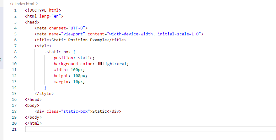• Static: Default value; elements are positioned according to the normal flow of the document.So as the example code I havw shared the .static box element will appear in the normal document flow. It will be positioned according to its place in my HTML and will be affected by margins and padding as usual.