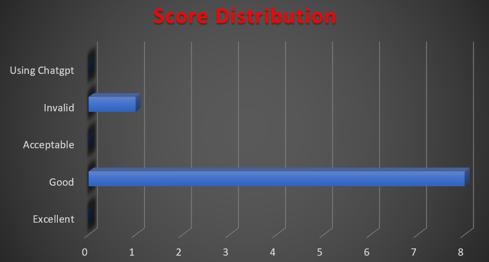 The distribution of scores and performance indicates a high level of engagement and quality among participants. The majority of submissions were of good and excellent quality, demonstrating participants' strong understanding and analytical skills in mastering the topic of JavaScript for creating interactive websites. As we move forward, it will be important to continue to encourage original and thoughtful contributions while ensuring compliance with the competition rules to maintain this high standard.
