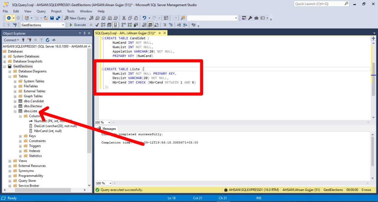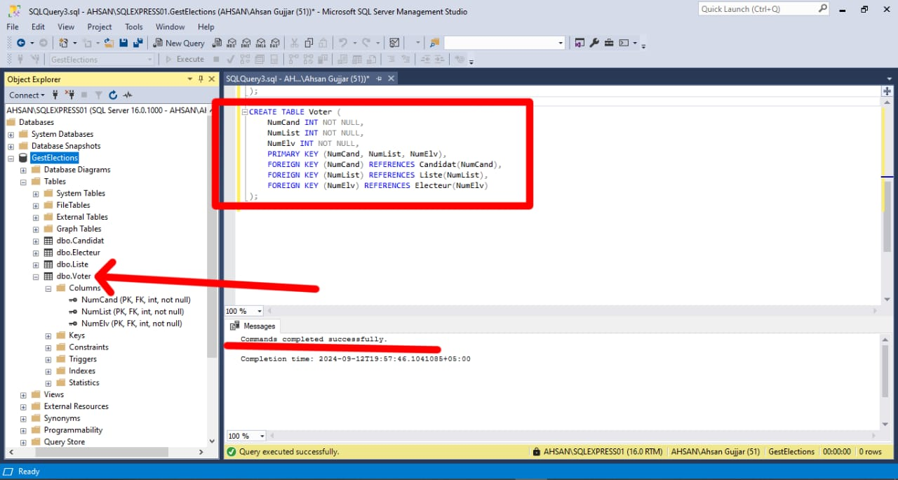 FOREIGN KEY constraints ensure that the values in NumCand, NumList, and NumElv reference valid records in the Candidat, Liste, and Electeur tables, respectively.
