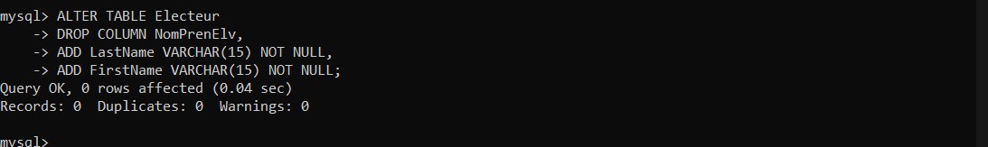 • Split the "NomPrenElv" column of the "Electeur" table into a "LastName" and "FirstName," each of 15 characters (both fields are mandatory).